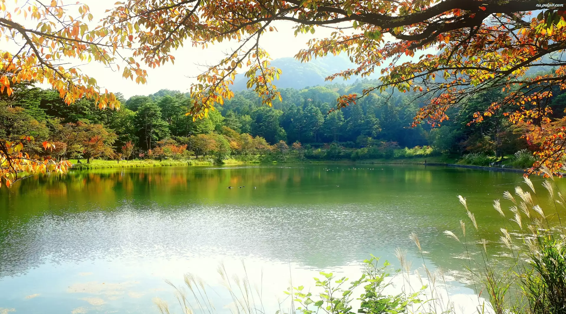 Trawy, Góry, Jezioro, Jesień, Kaczki, Lasy