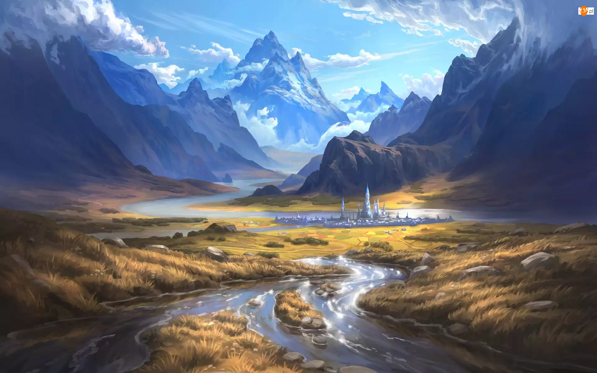 Trawy, Grafika, Góry, Rzeka
