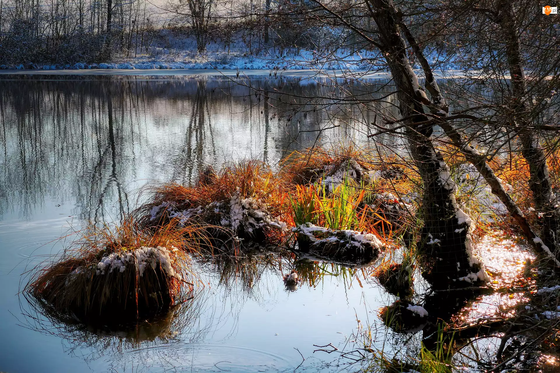 Drzewa, Zima, Jezioro, Trawa