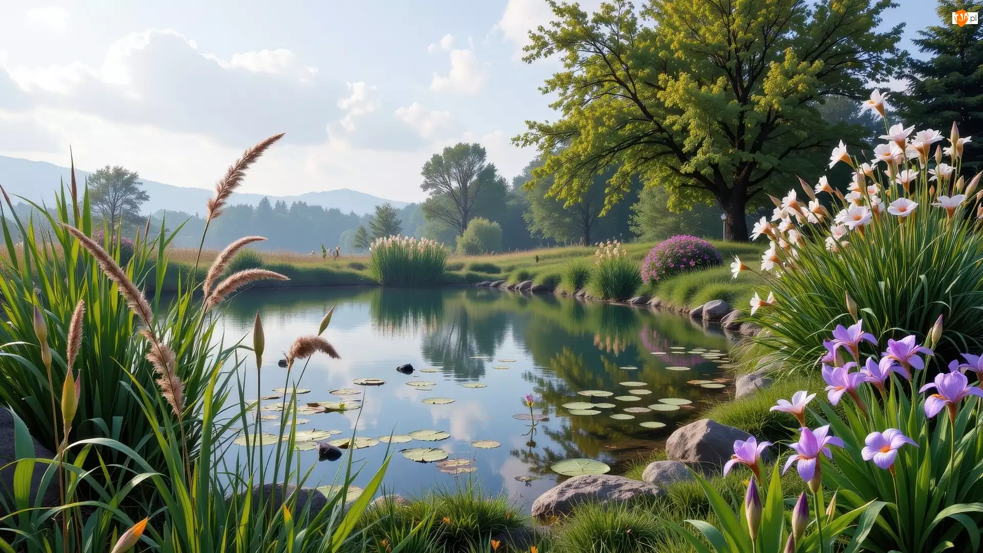 Trawy, Staw, Kwiaty, Drzewa, Białe, Kwitnące, G�