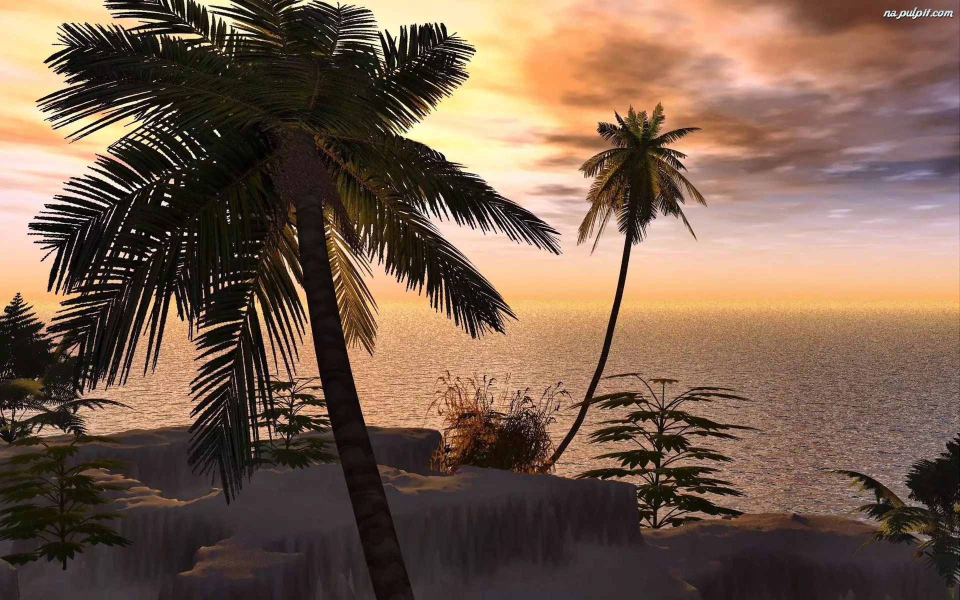 Tropik, Zachód, Ocean, Słońca, Palmy