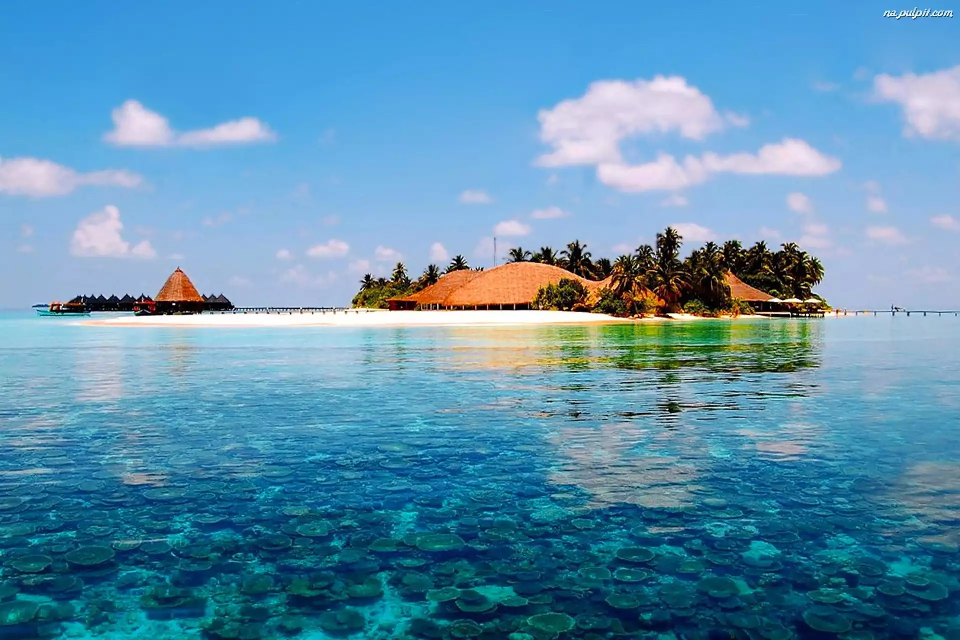Tropiki, Wyspa, Palmy, Domy, Morze