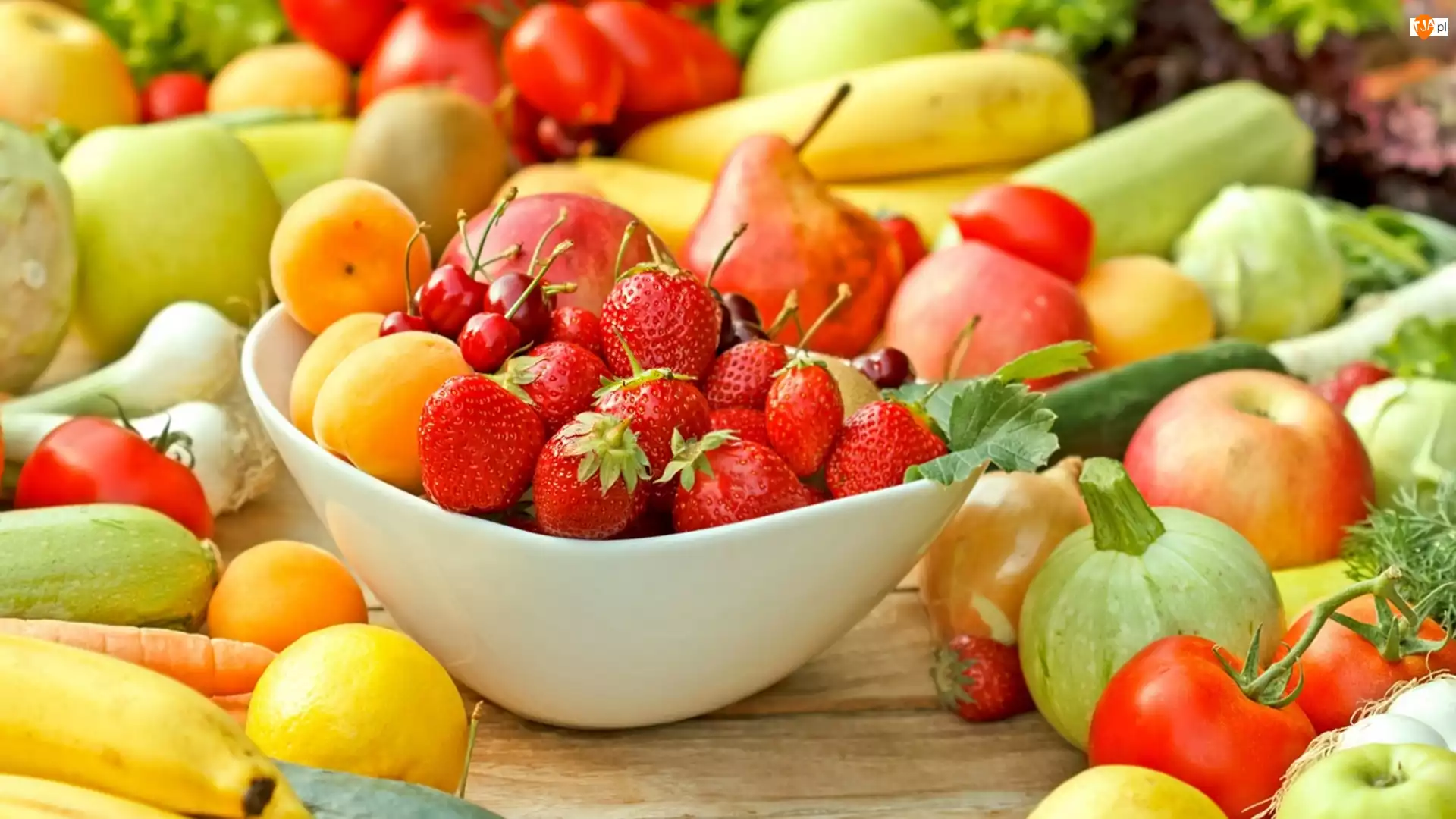 Owoce, Truskawki, Jabłka, Miseczka, Banany, Morele, Wiśnie