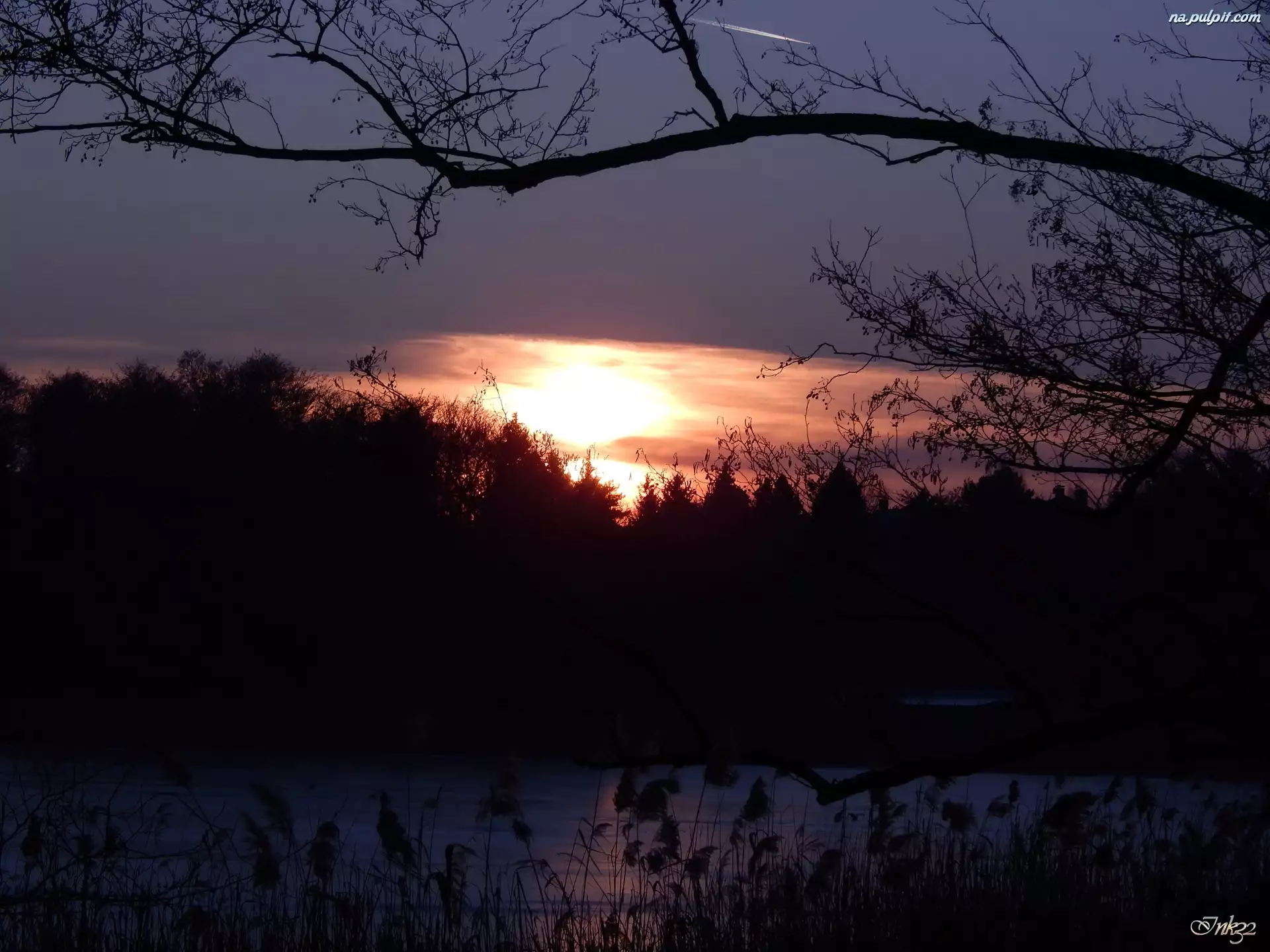 Drzewa, Trzcina, Słońca, Zachód, Gałęzie