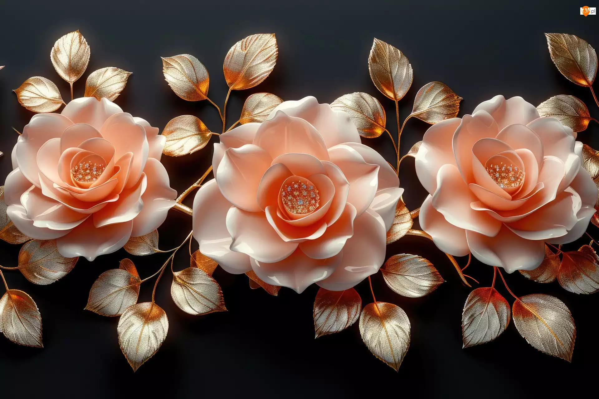 Trzy, Brzoskwiniowe, Złote, Łodygi, Róże, Listki