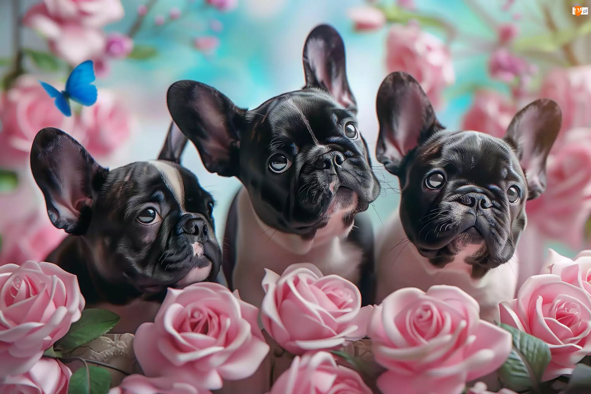 Trzy, Buldog francuski, Róże, Grafika, Psy, Kwia