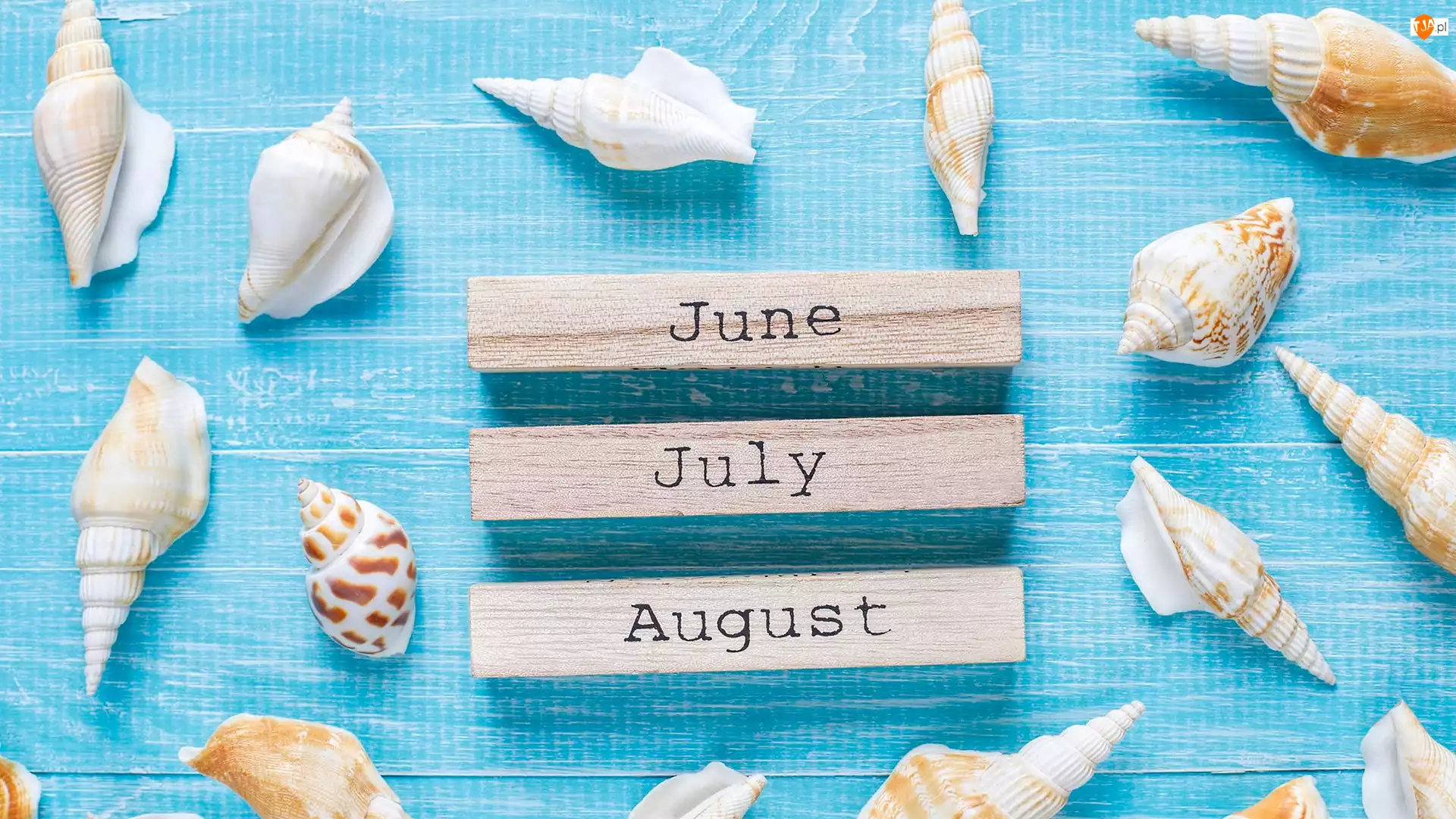June, Muszelki, August, Niebieskie, Klocki, July, Tło, Napis