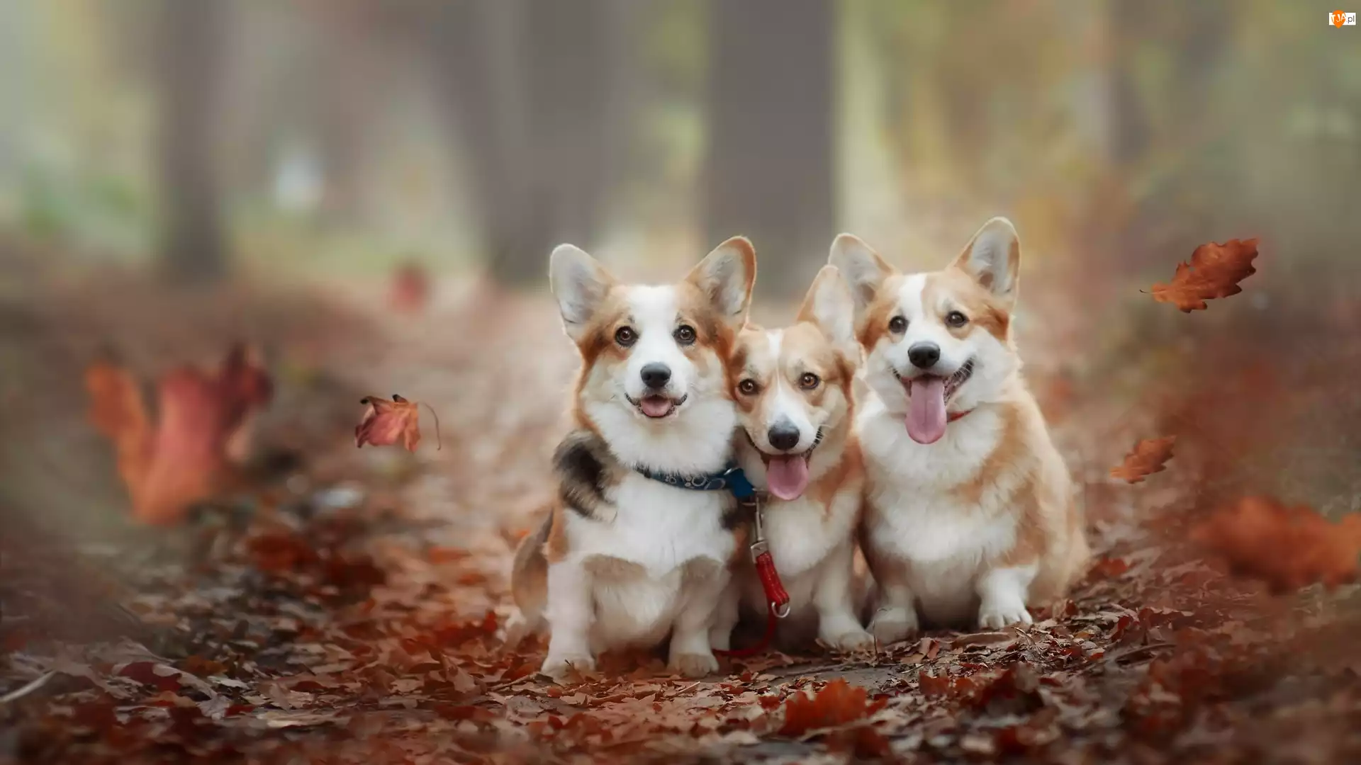 Trzy, Liście, Psy, Welsh corgi pembroke