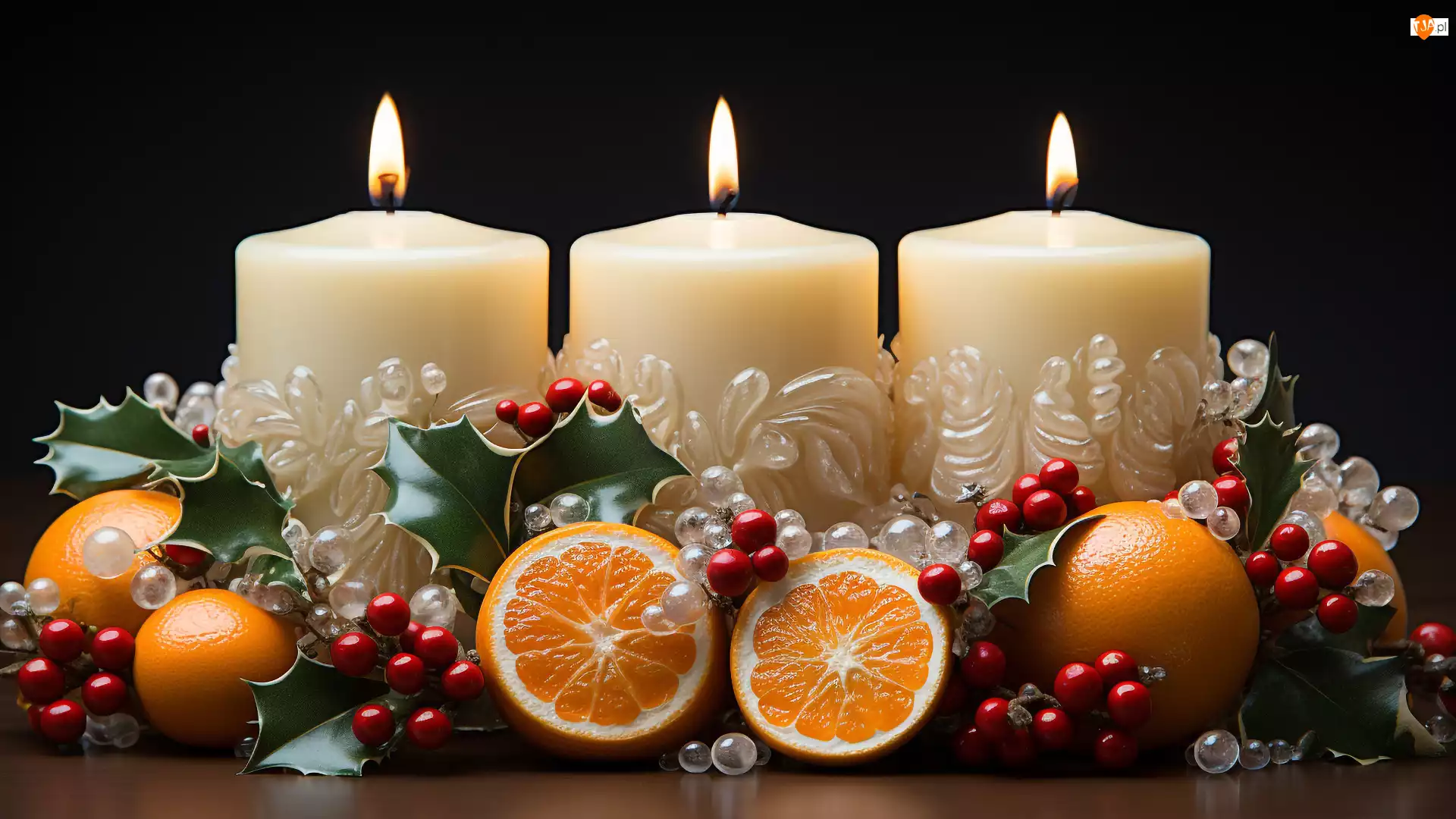 Trzy, Świece, Grafika, Adwent, Pomarańcze, Jagody, Ostrokrzew