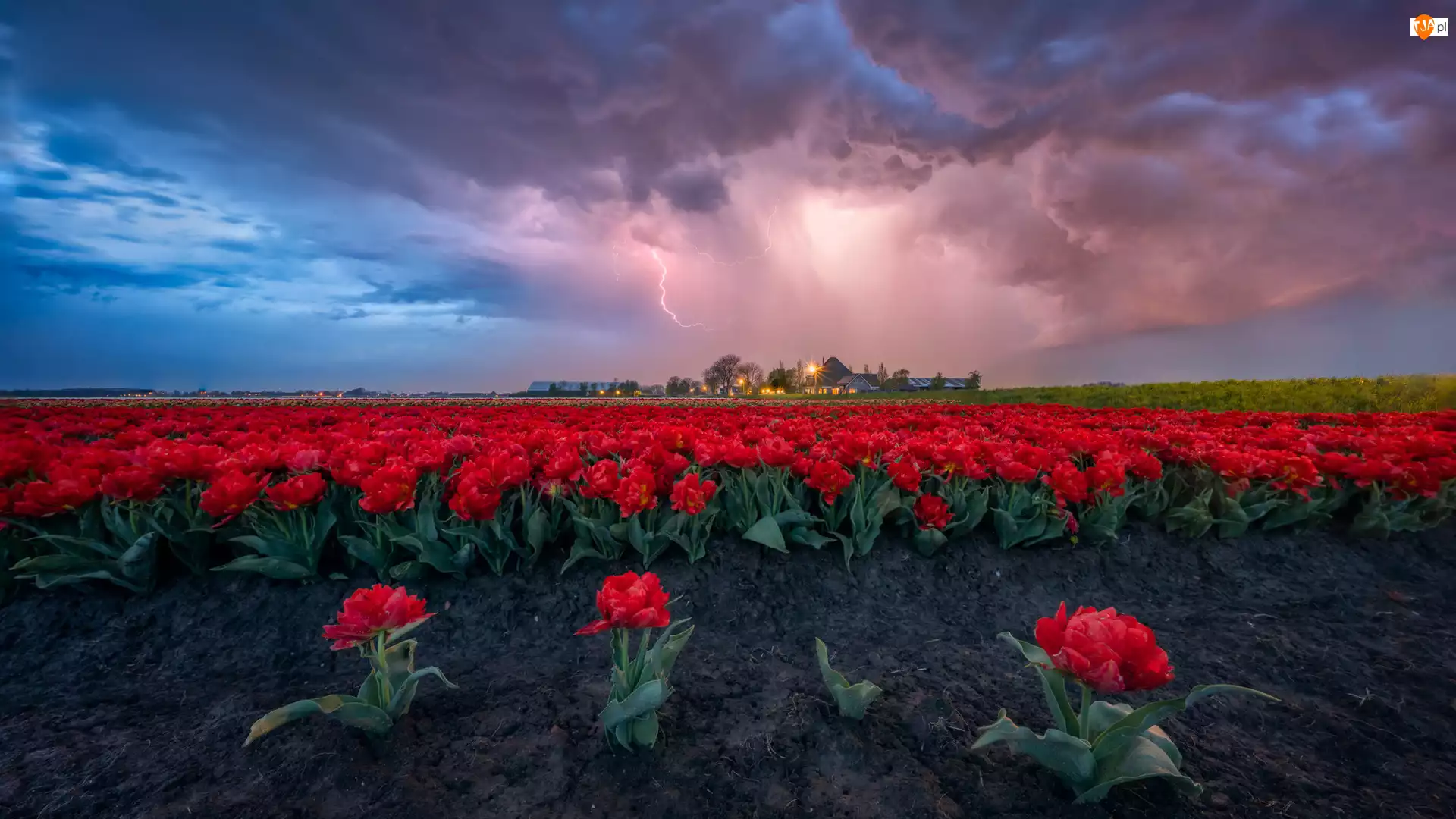 Tulipany, Chmury, Pole, Czerwone, Ciemne