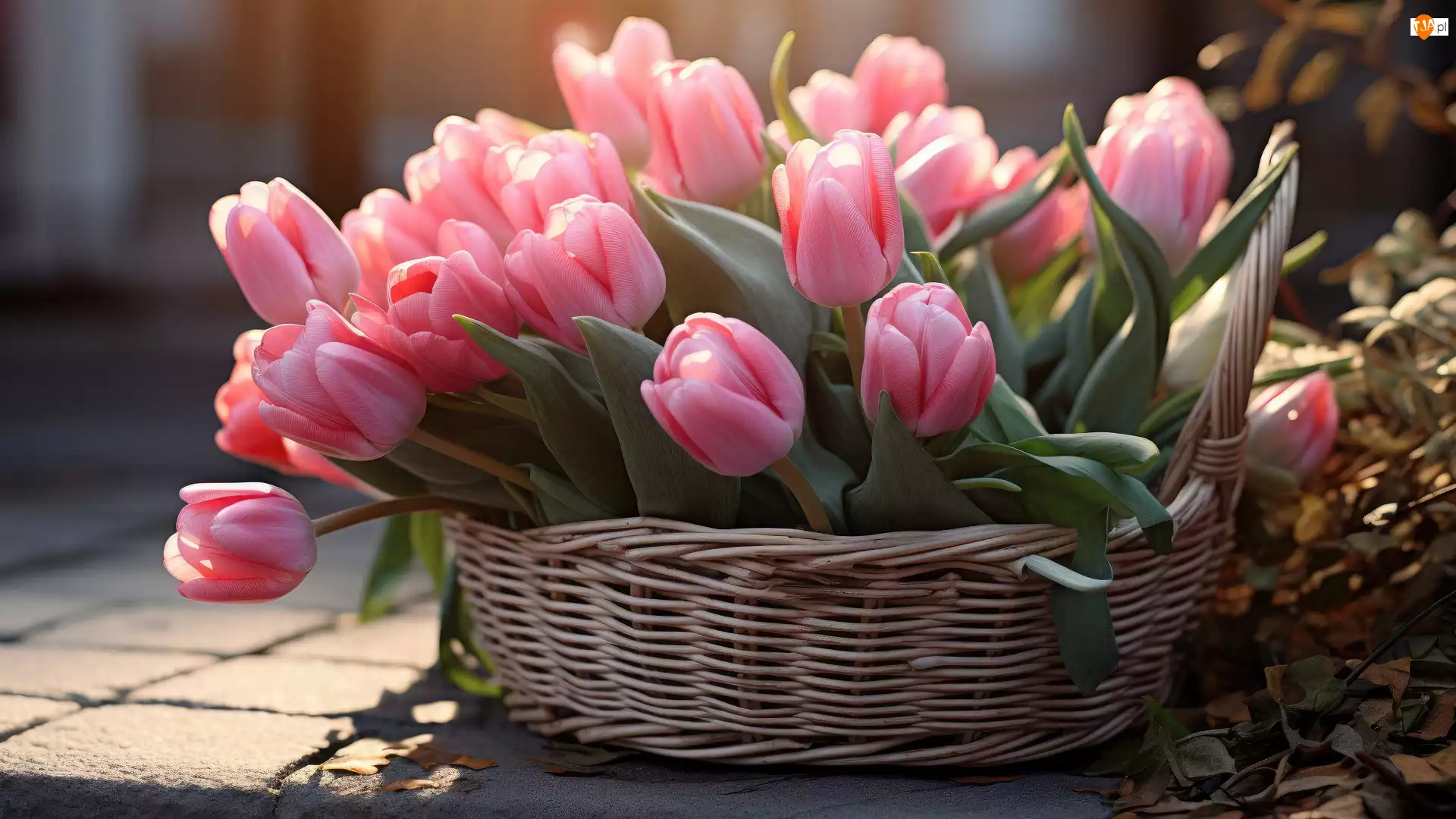 Tulipany, Chodnik, Różowe, Kwiaty, Koszyk