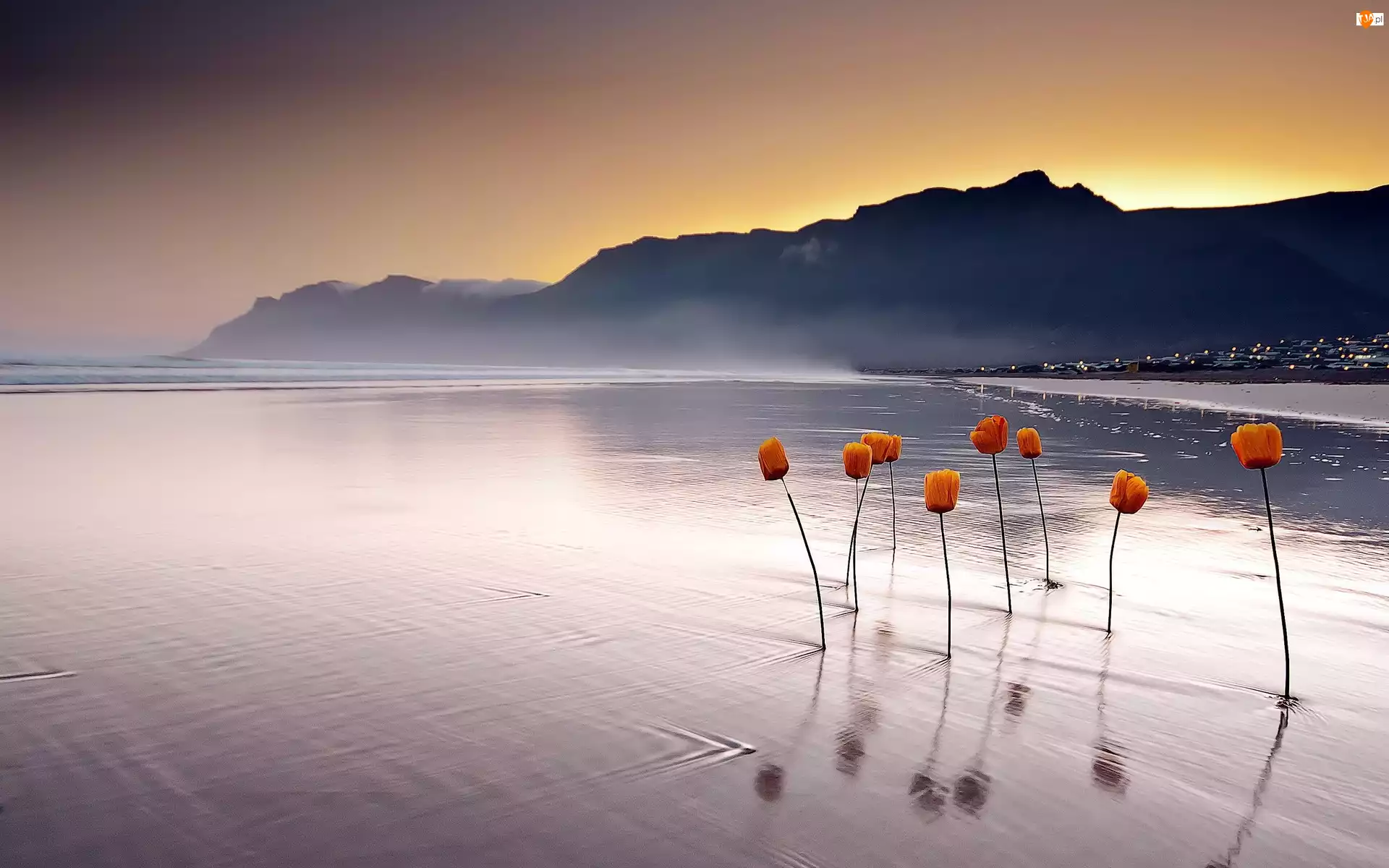 Tulipany, Góry, Słońca, Zachód, Woda