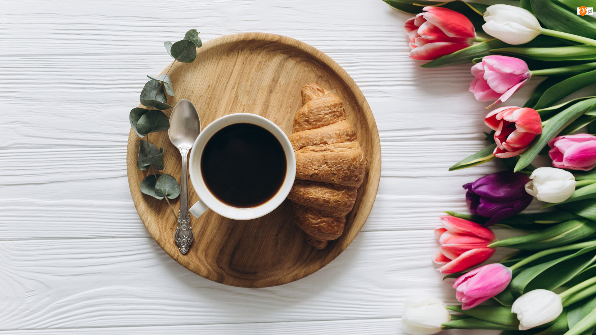 Tulipany i kawa na deskach