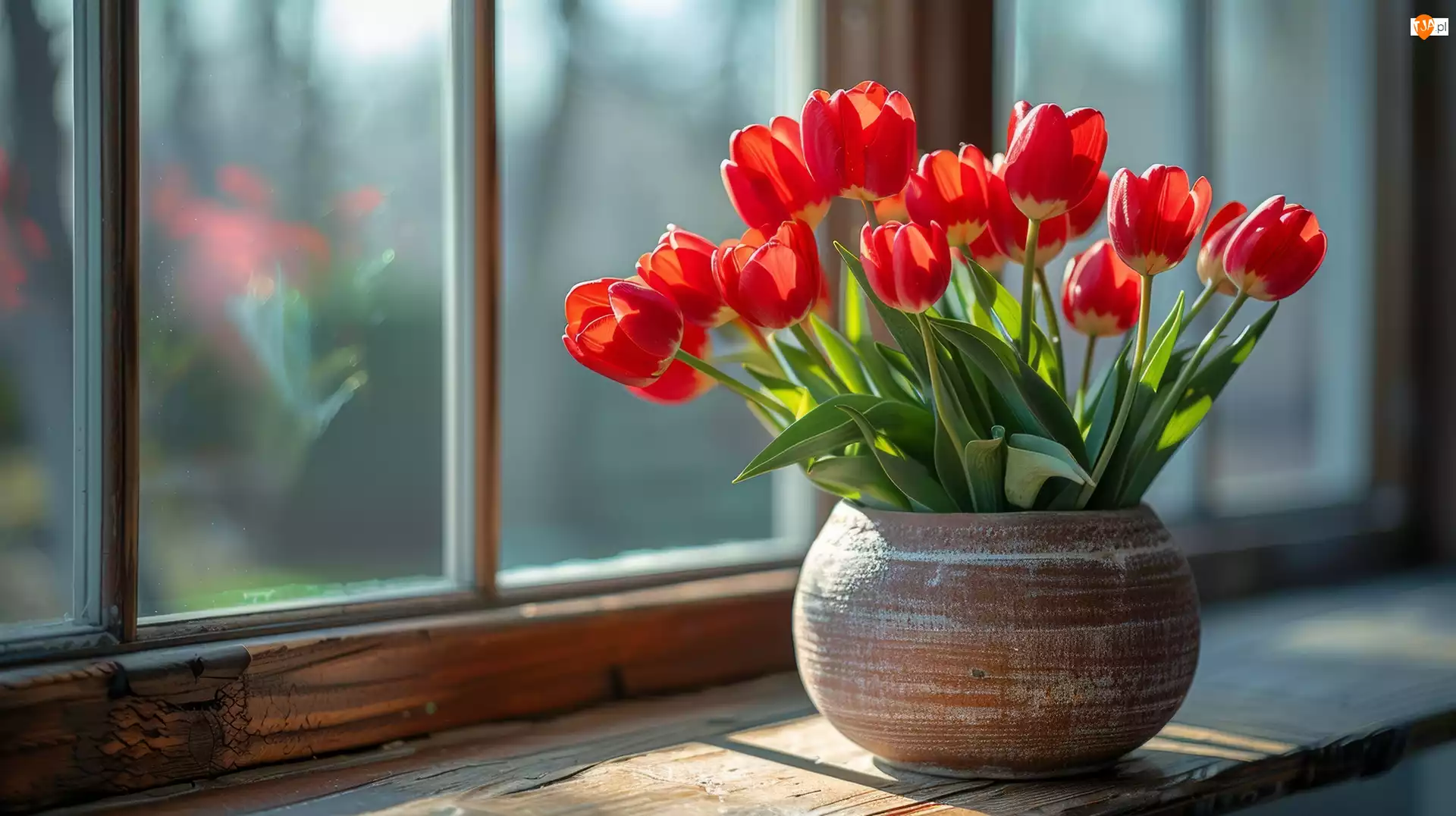 Tulipany, Okno, Czerwone, Bukiet, Wazon