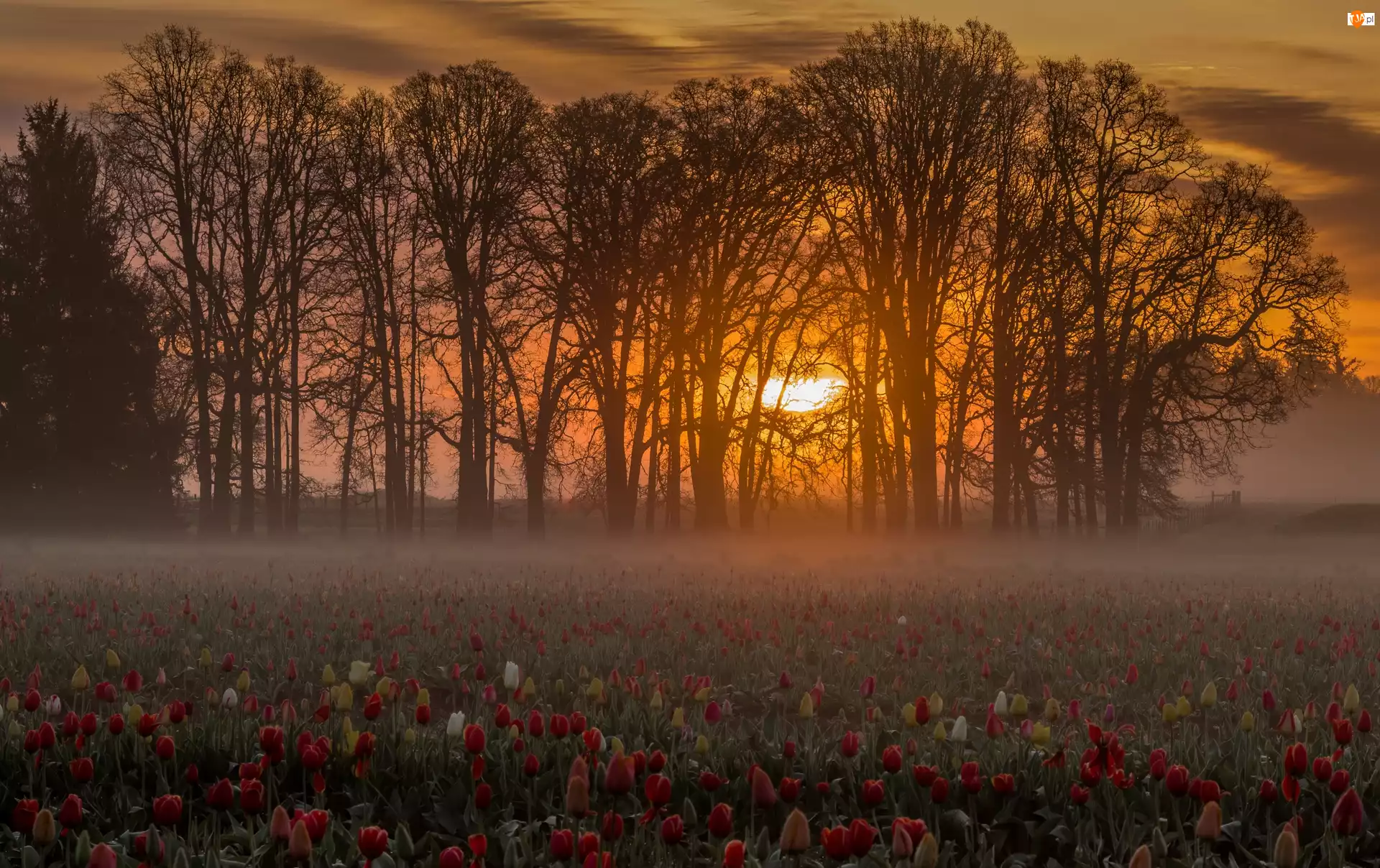 Tulipany, Pole, Mgła, Słońca, Drzewa, Zachód