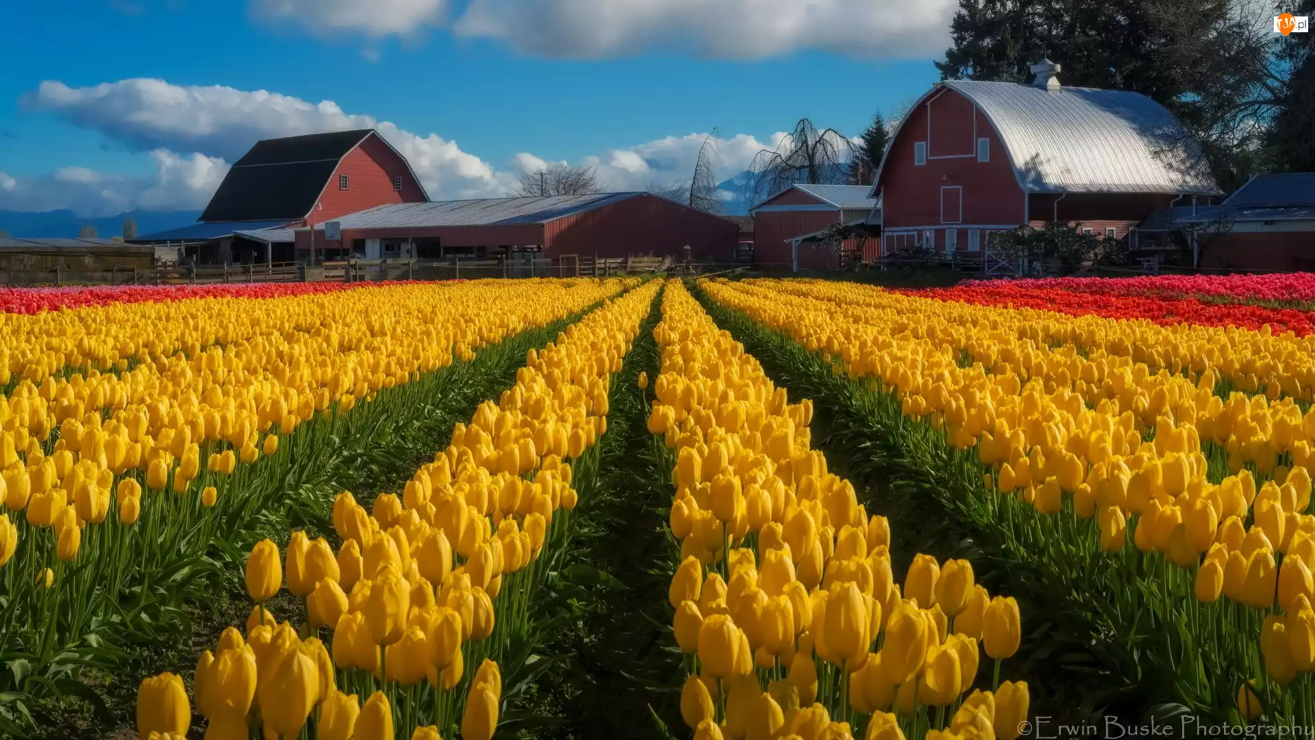 Tulipany, Pole, Stany Zjednoczone, Plantacja, Stan Waszyngton, Skagit Valley, Domy