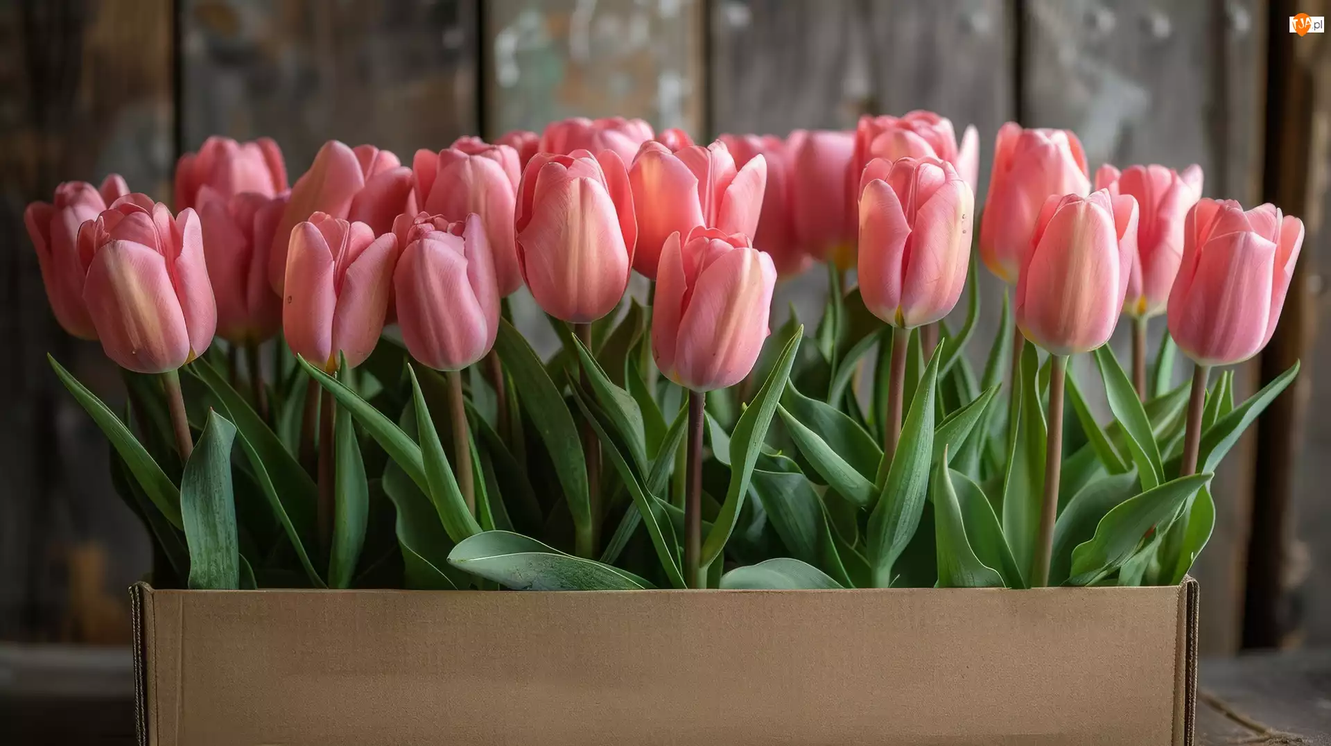 Tulipany, Pudełko, Różowe, Kwiaty, Listki