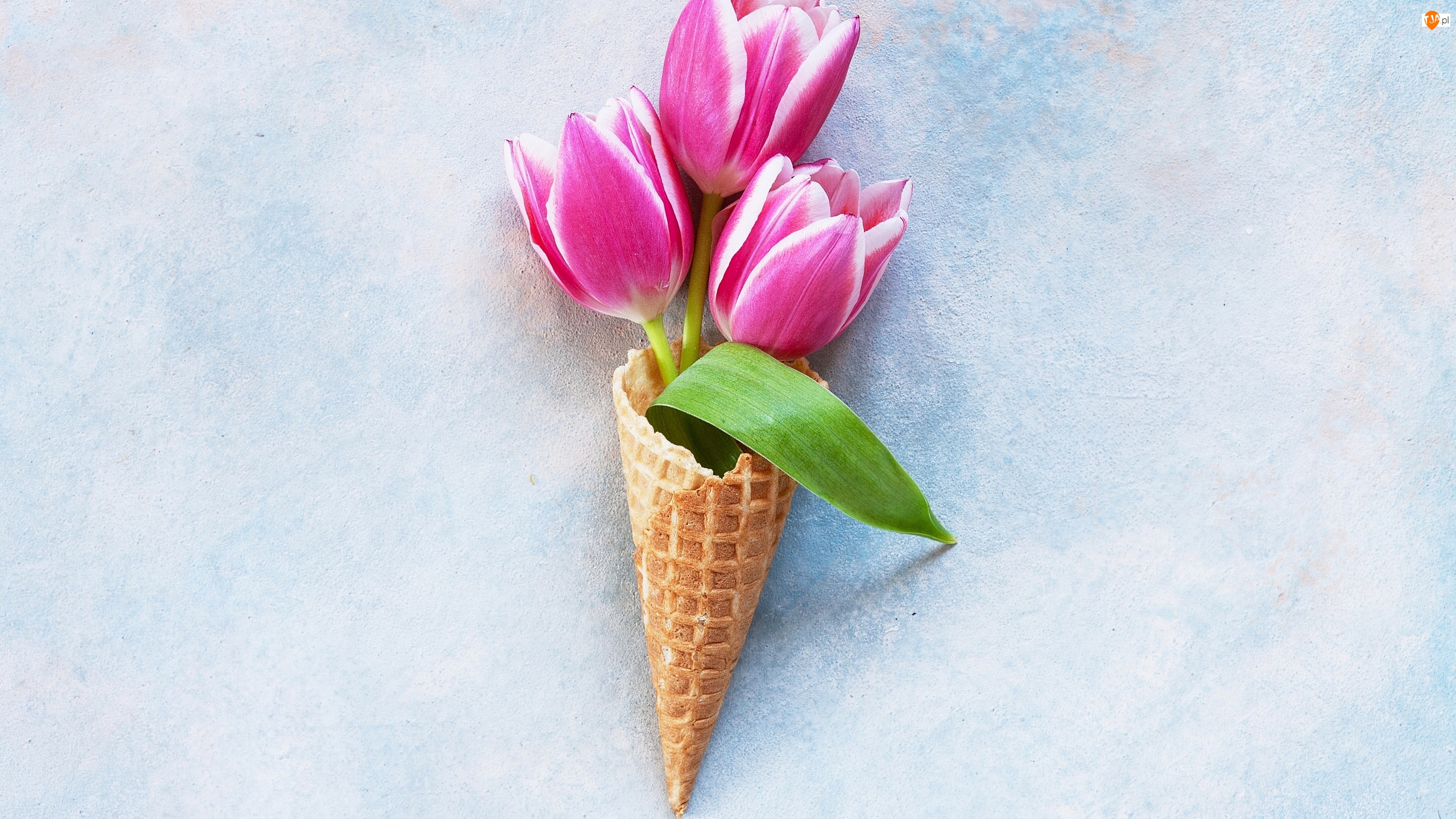 Trzy, Tulipany, Tło, Kwiat, Biało-niebieskie, Waflowy, Rożek