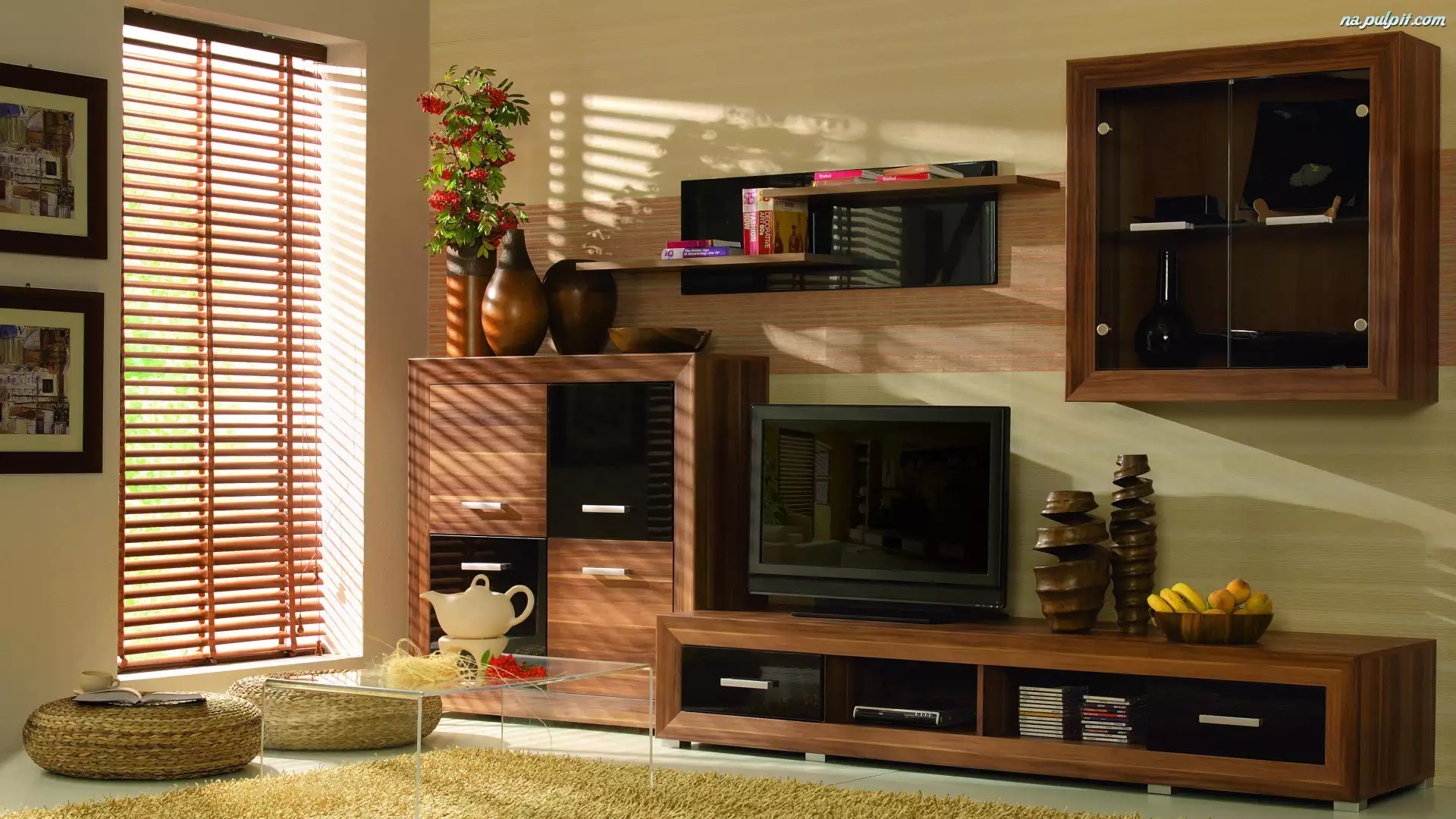 Szafki, Brązowe, Stolik, Pokój, Szklany, Żaluzje, Meble