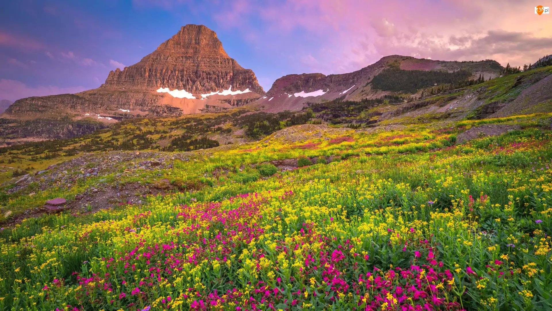 Stany Zjednoczone, Polana, Montana, Łąka, Niebo, Kwiaty, Góra, Park Narodowy Glacier, Mount Reynolds