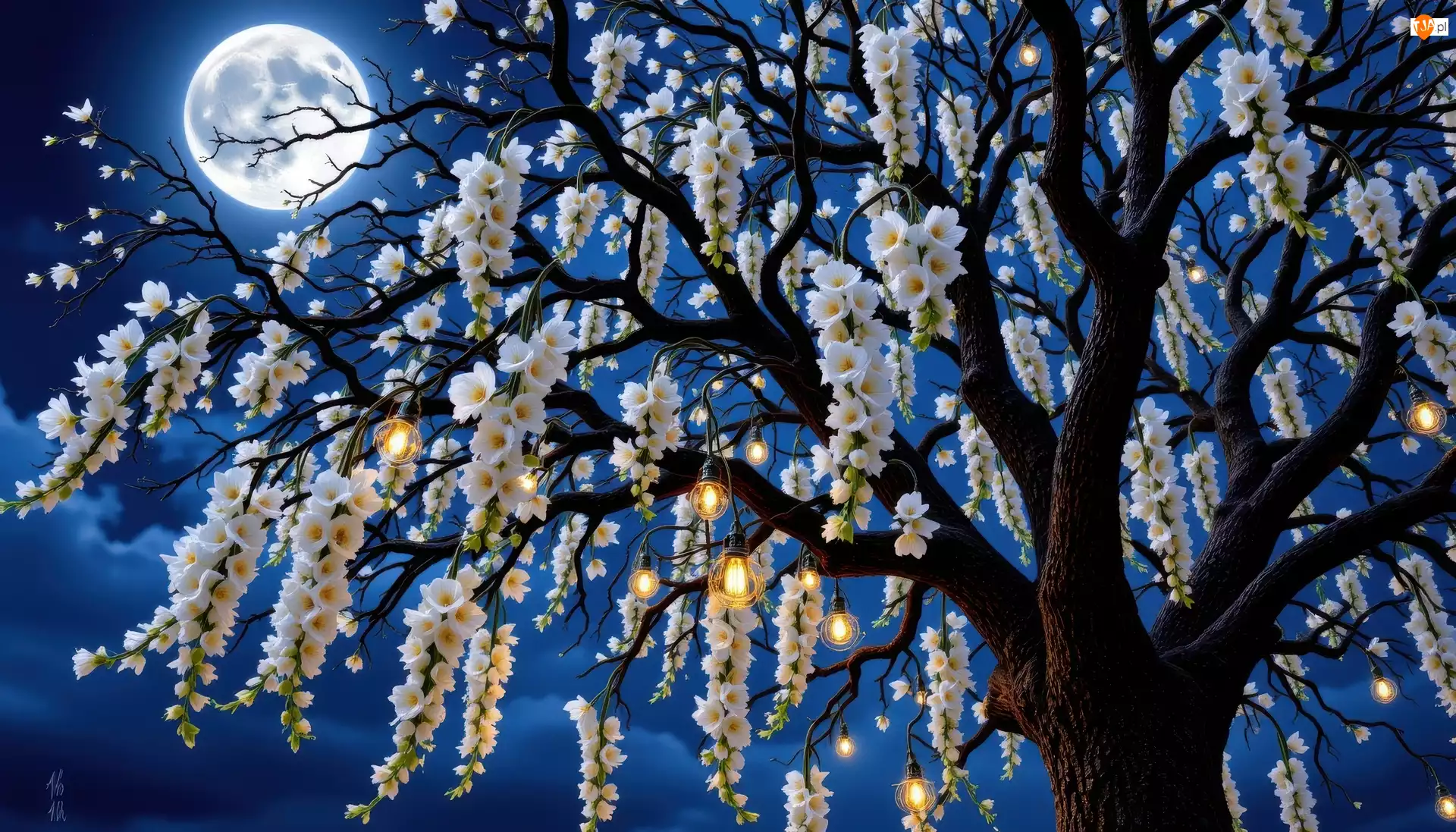 Ukwiecone drzewo w świetle księżyca