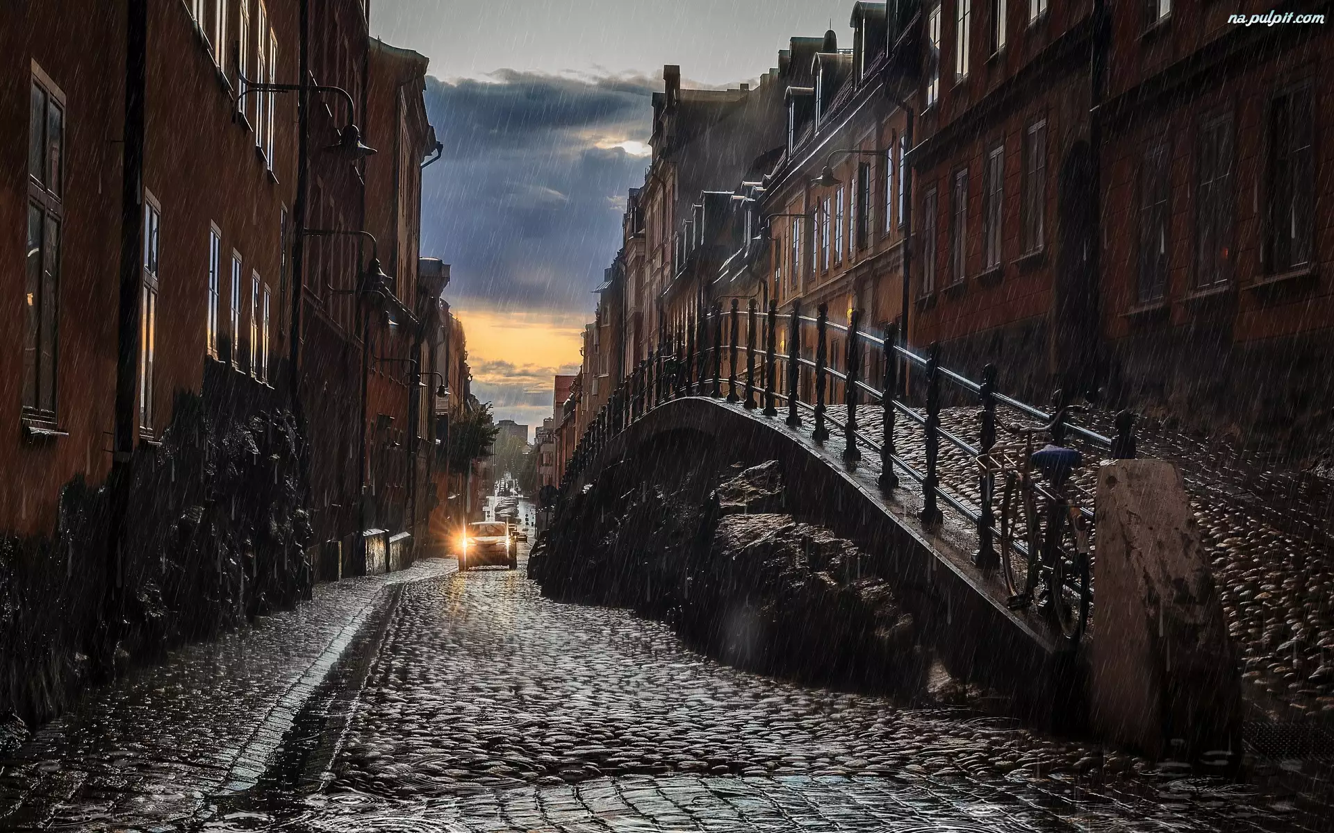 Kamienice, Bruk, Deszcz, Domy, Rower, Samochód, Ulica