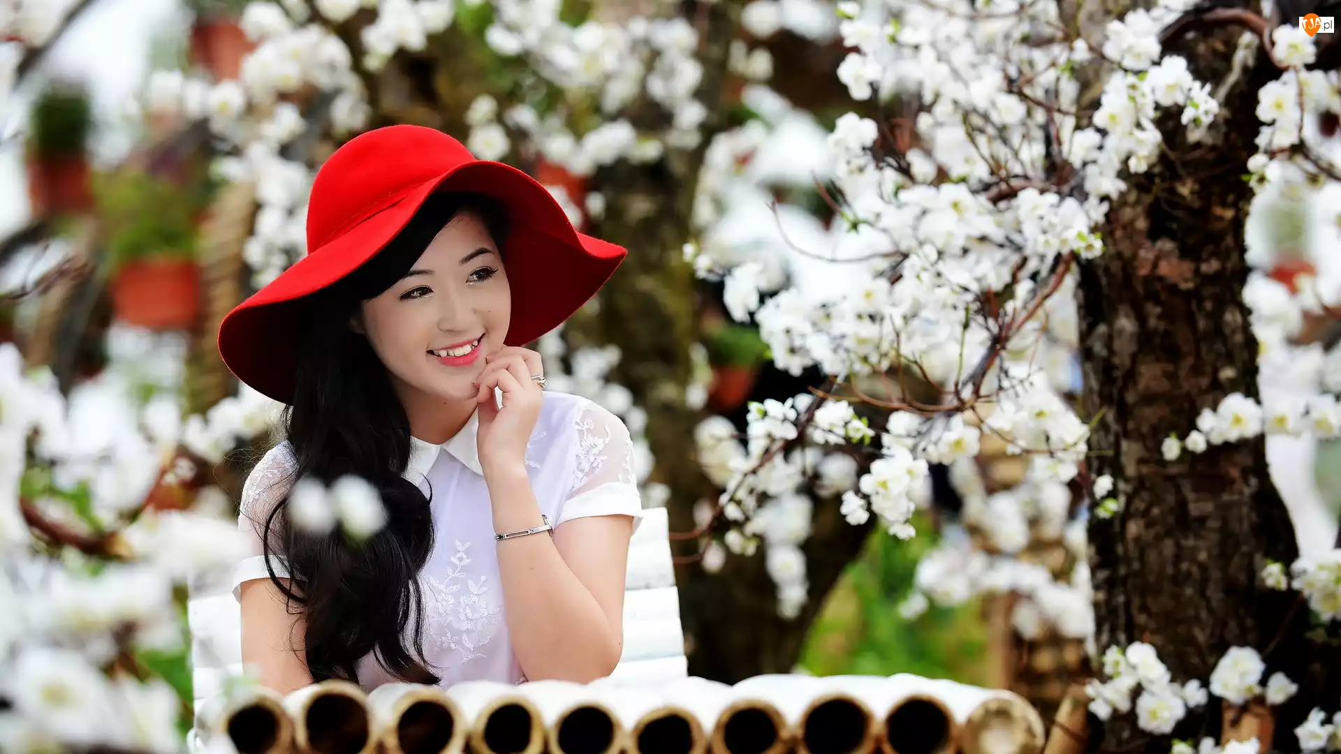 Dziewczyna, Kapelusz, Uśmiech, Drzewa, Azjatka, Kwitnące