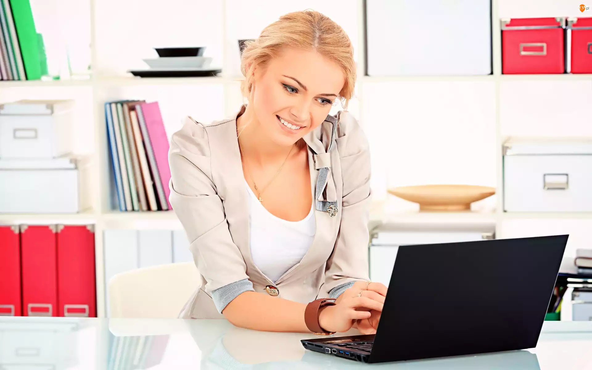 Uśmiechnięta, Biuro, Blondynka, Laptop