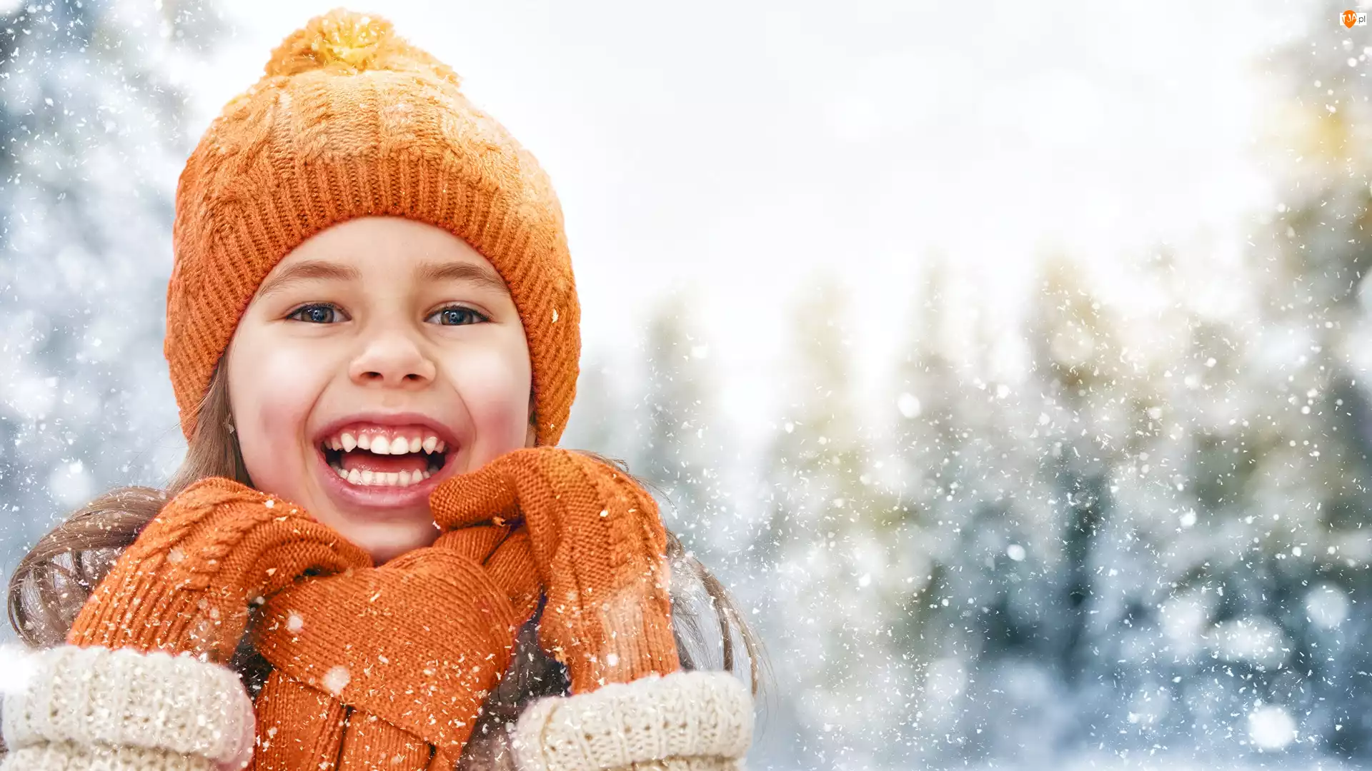 Rękawiczki, Uśmiechnięta, Czapka, Dzianina, Dziewczynka, Szalik, Zima, Pomarańczowa