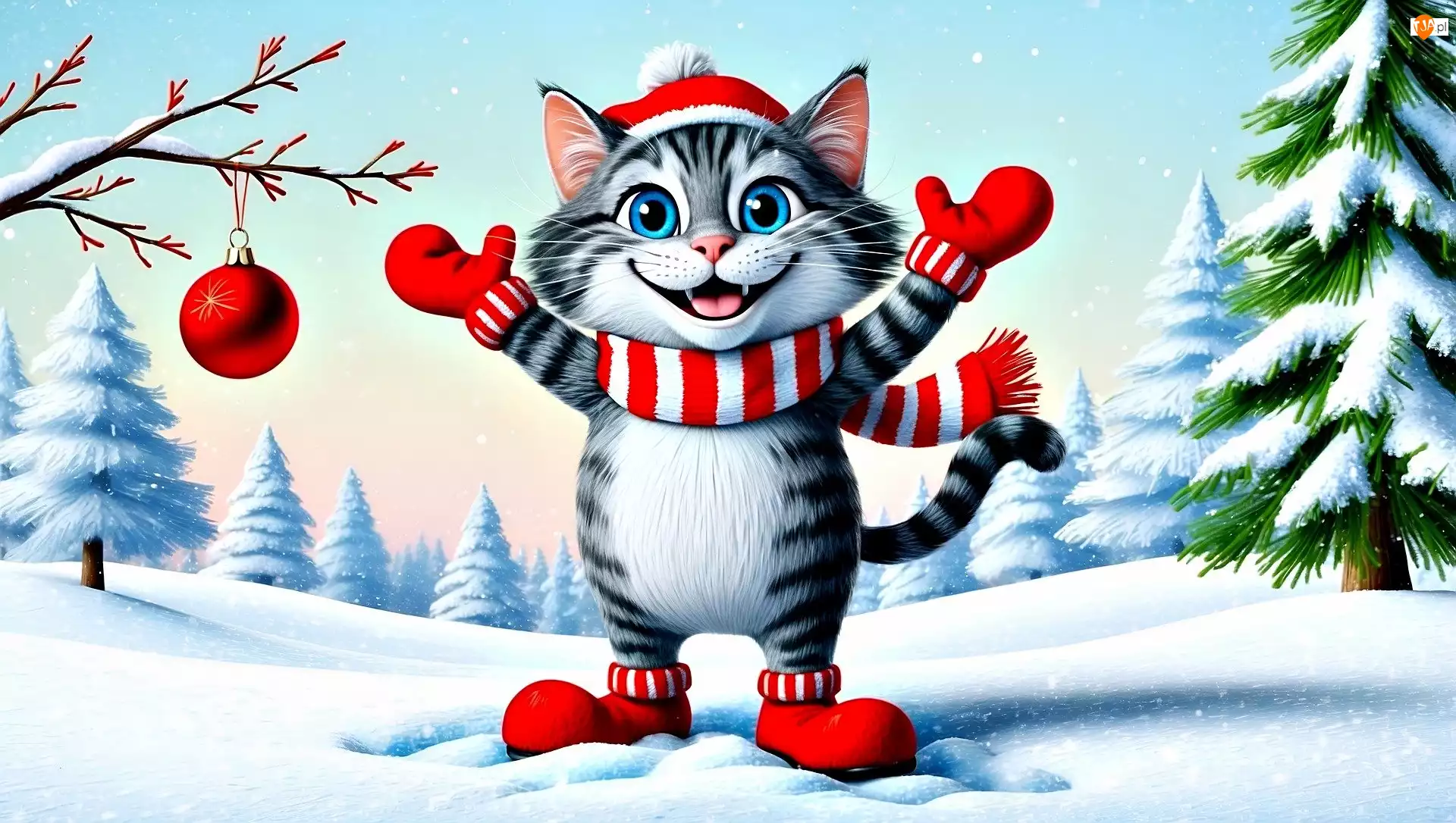 Czapka, Kot, Rękawice, Drzewa, Szalik, Śnieg