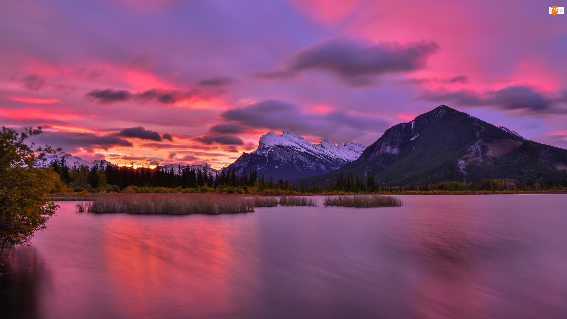 Vermilion Lake, Niebo, Park Narodowy Banff, Drzewa, Canadian Rockies, Prowincja Alberta, Kolorowe, Góry, Odbicie, Jezioro, Kanada