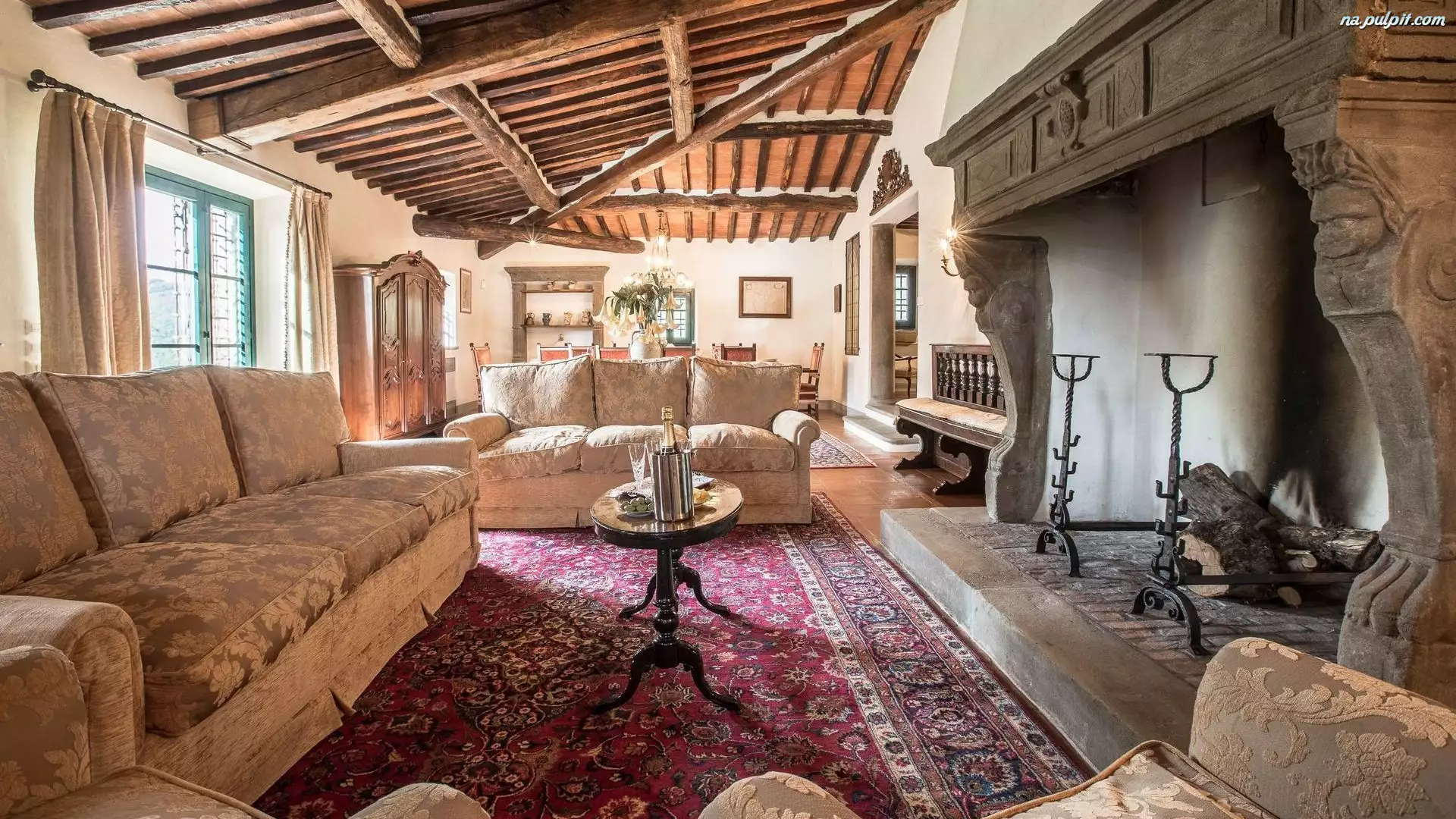 Pokój, Wnętrze, Kominek, Sufit, Kanapy, Drewniany