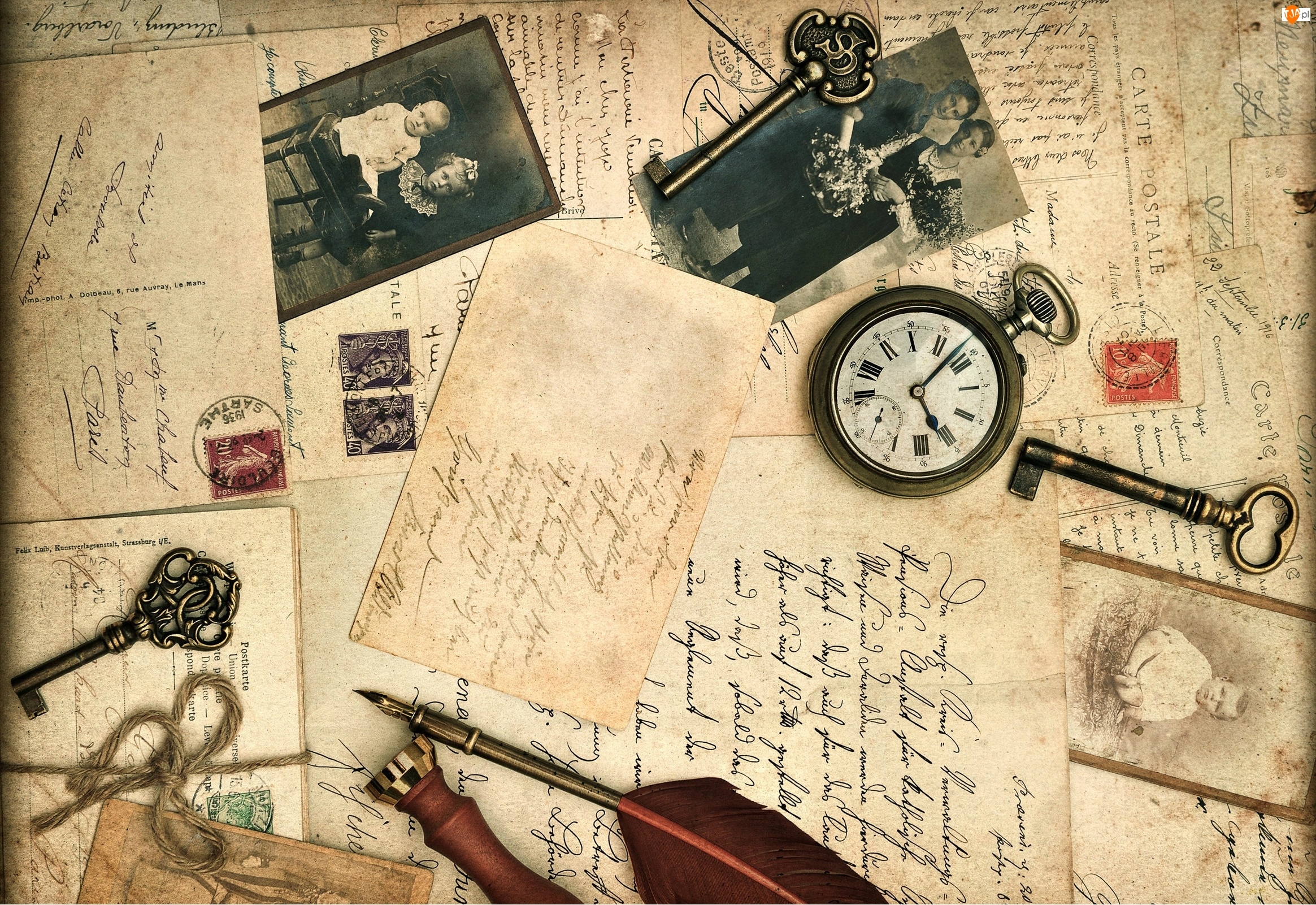 Klucze, Vintage, Zegarek Kieszonkowy, Listy, Pióra