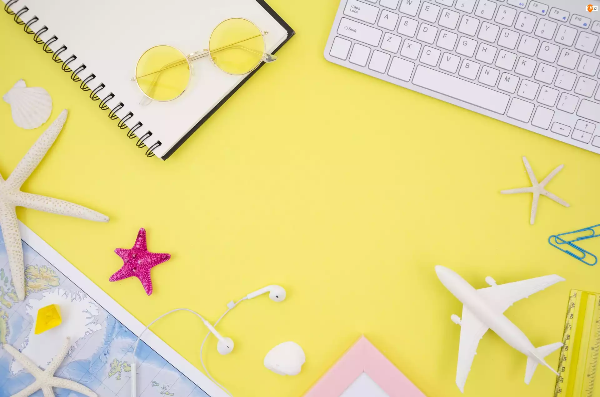 Wakacje, Rozgwiazdy, Samolot, Notatnik, Okulary, Muszelki, Słuchawki, Mapa, Komputer
