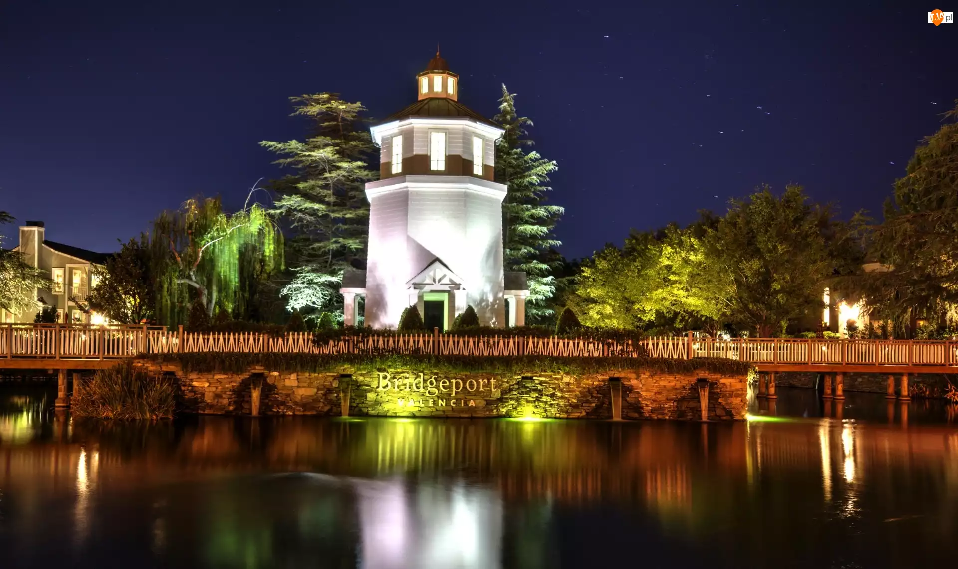 Drzewa, Walencja, Zabudowania, Most, Noc