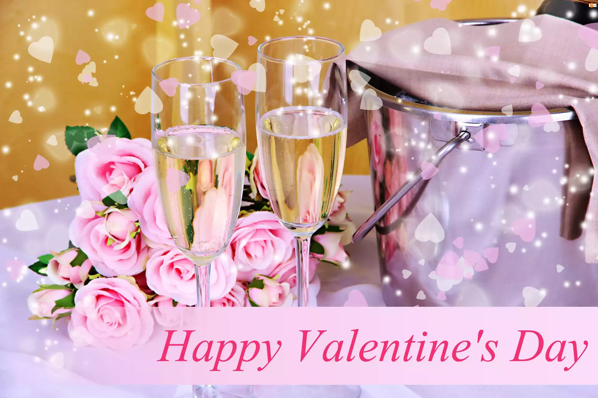 Walentynki, Bukiet, Szampan, Róż, Serduszka