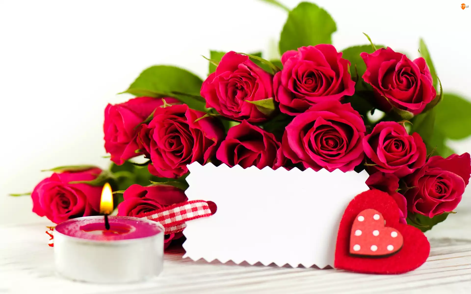 Walentynki, Serduszka, Czerwone, Bukiet, Kartka, Róże, Świeca