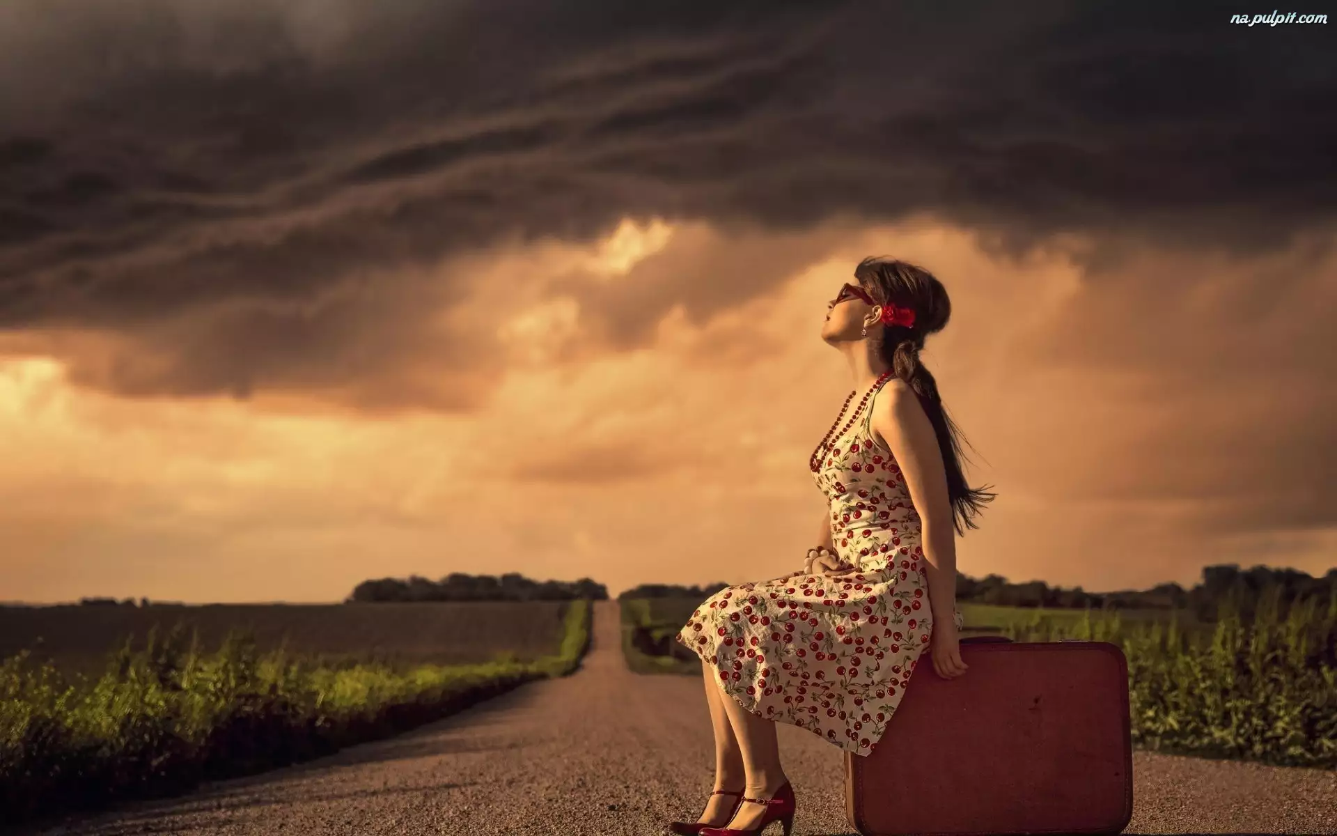 Walizka, Pole, Kobieta, Chmury, Biżuteria, Droga