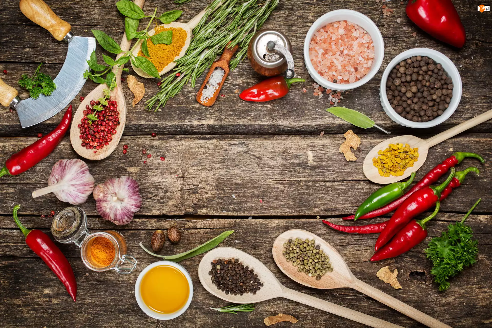 Czosnek, Przyprawy, Miseczki, Deski, Papryki chili, Łyżki