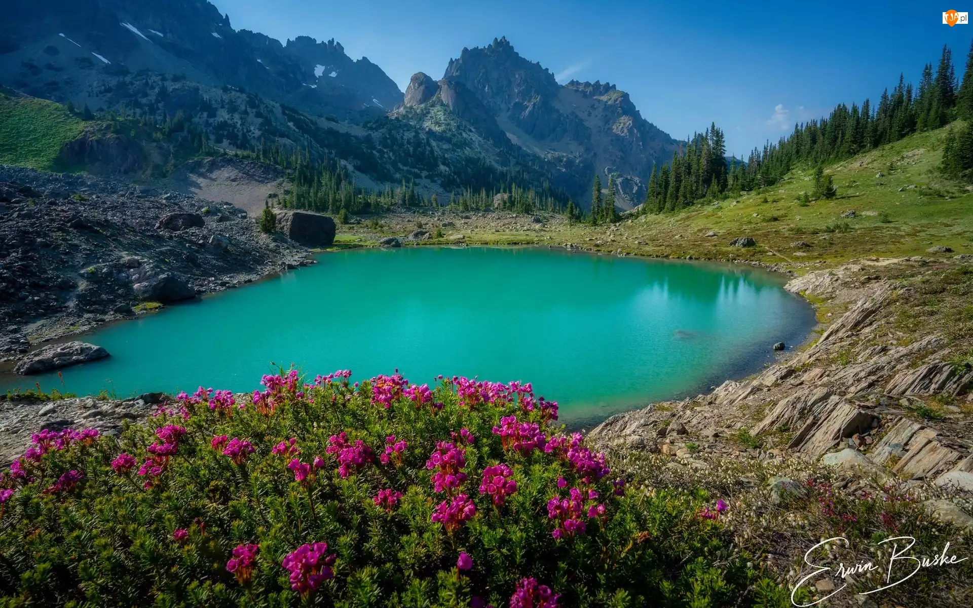 Waszyngton, Park Narodowy Olympic, Drzewa. Kwiaty, Stany Zjednoczone, Góry, Upper Royal Basin, Staw