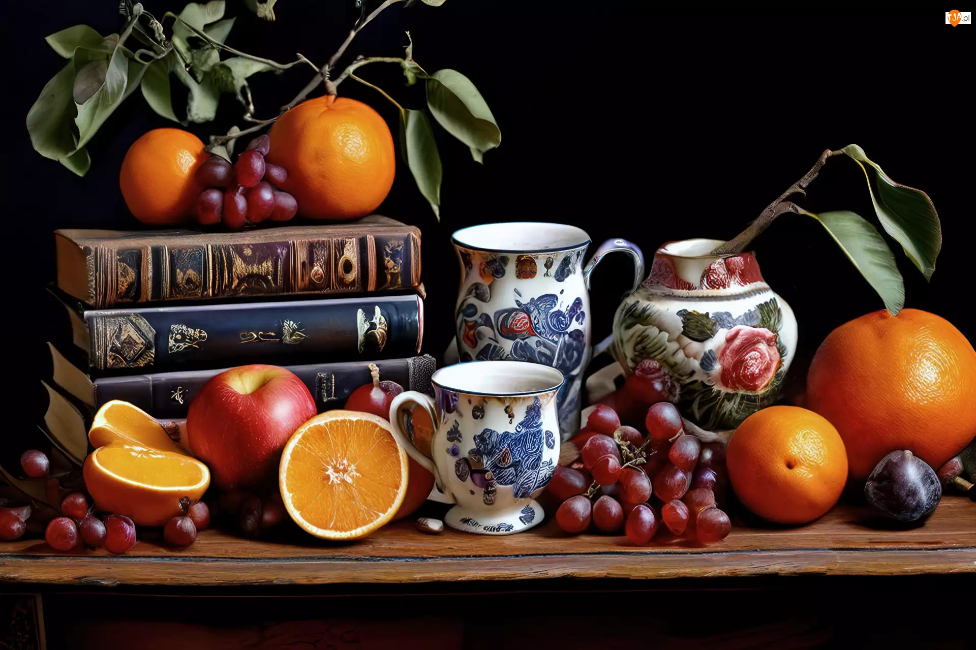 Owoce, Pomarańcze, Dzbanek, Książki, Wazon, Kubek, Winogrona