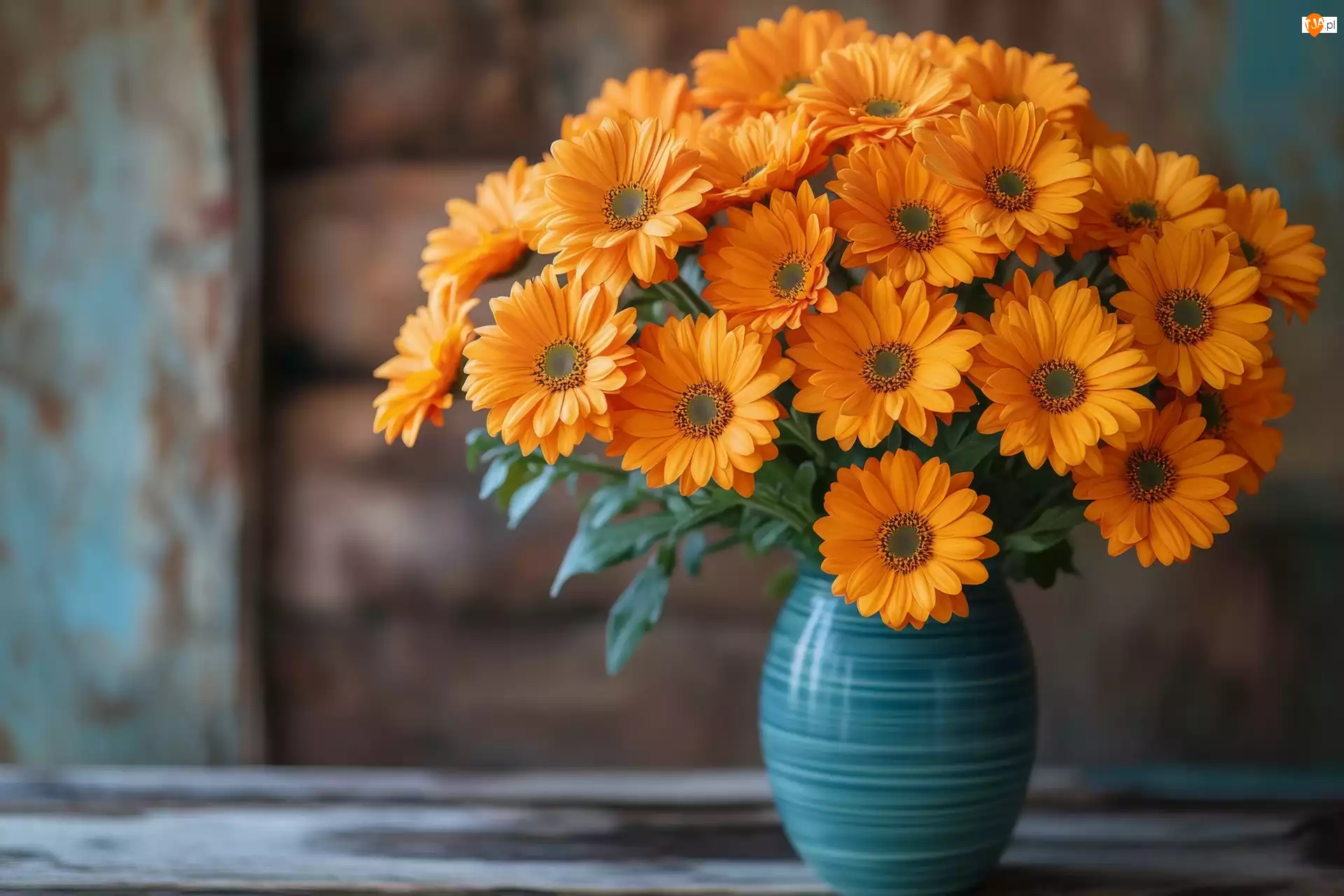 Wazon, Pomarańczowe, Kwiaty, Niebieski