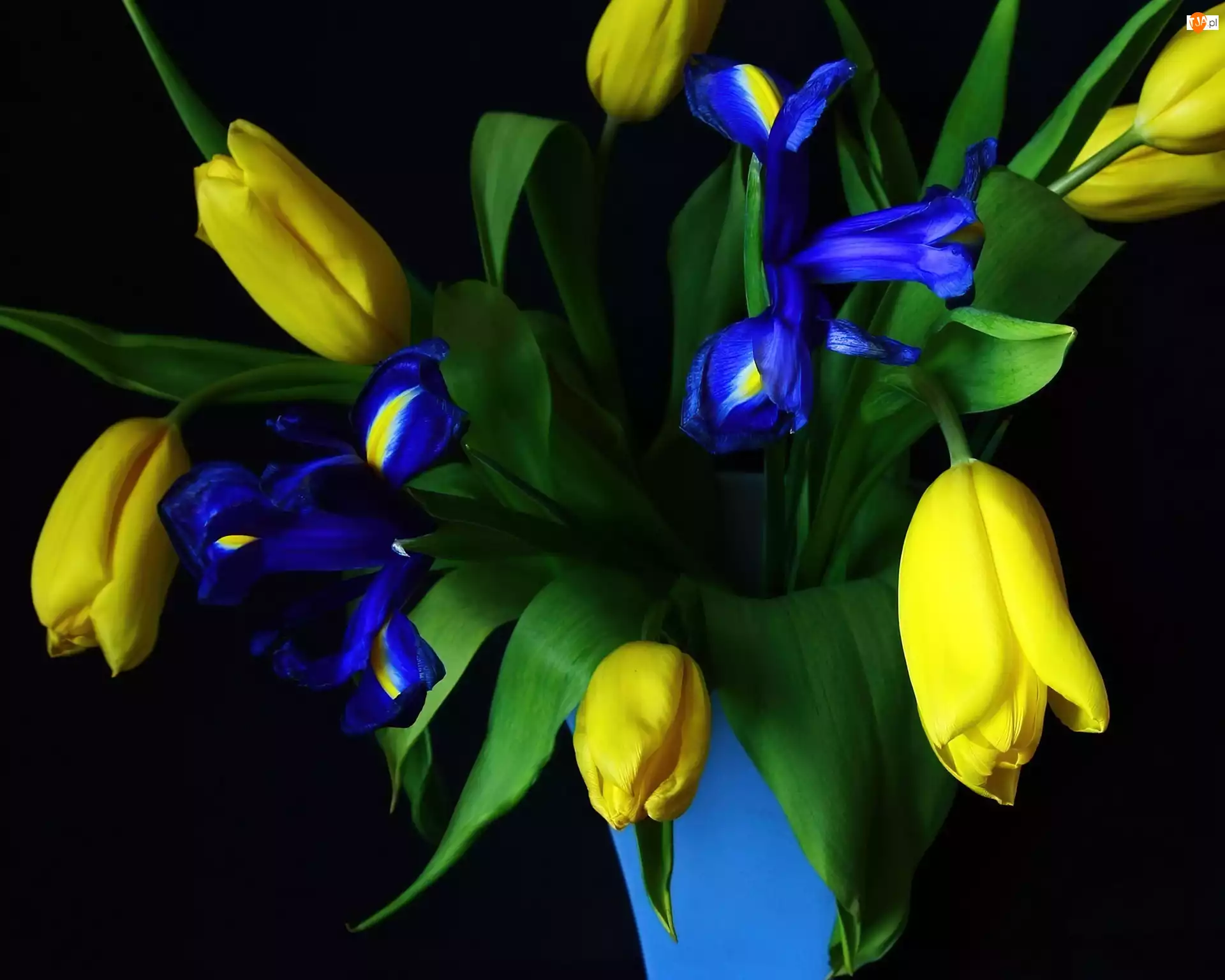 Wazon, Żółte, Irysy, Tulipany, Niebieski