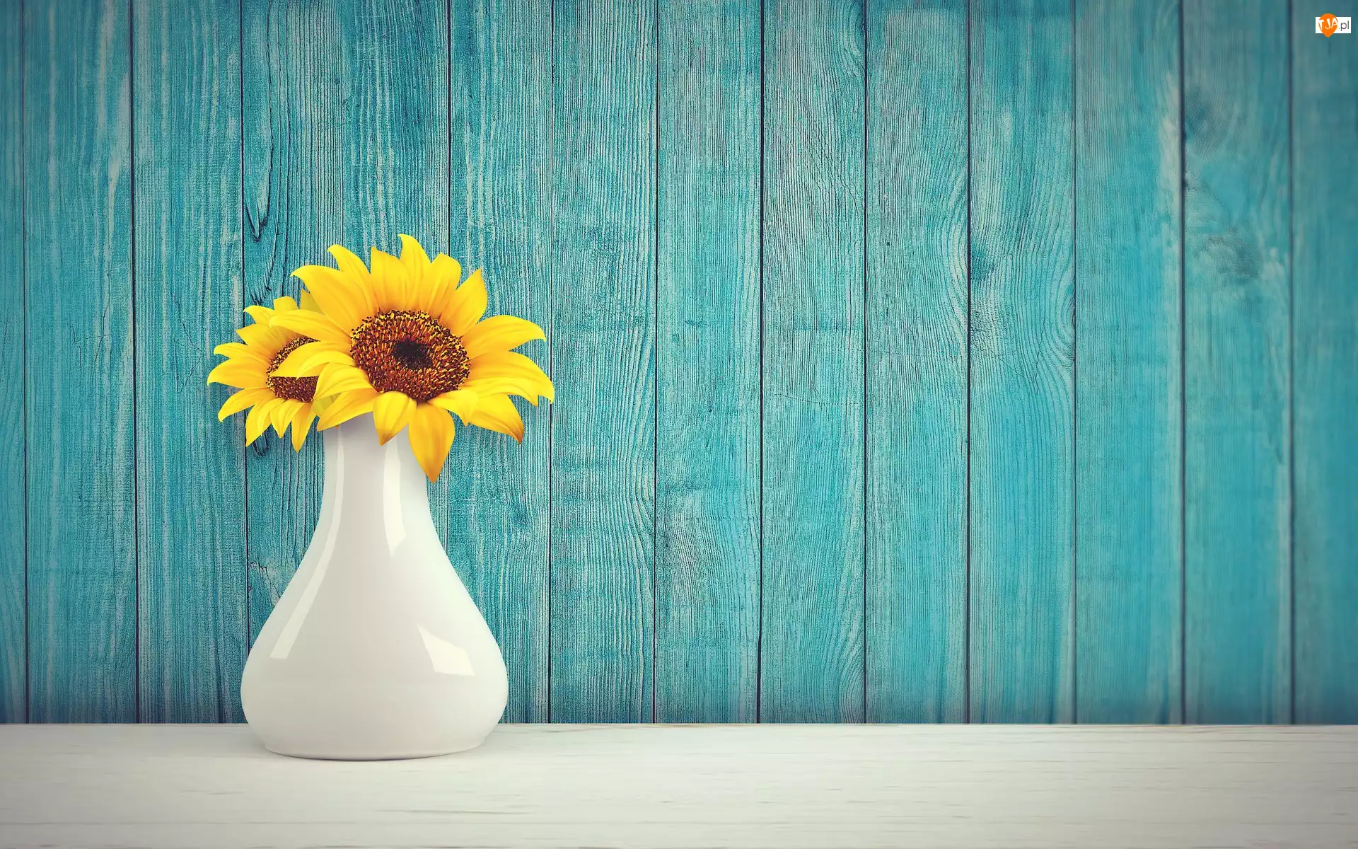 Słoneczniki ozdobne, Deski, Dwa, Wazonik, Niebieskie