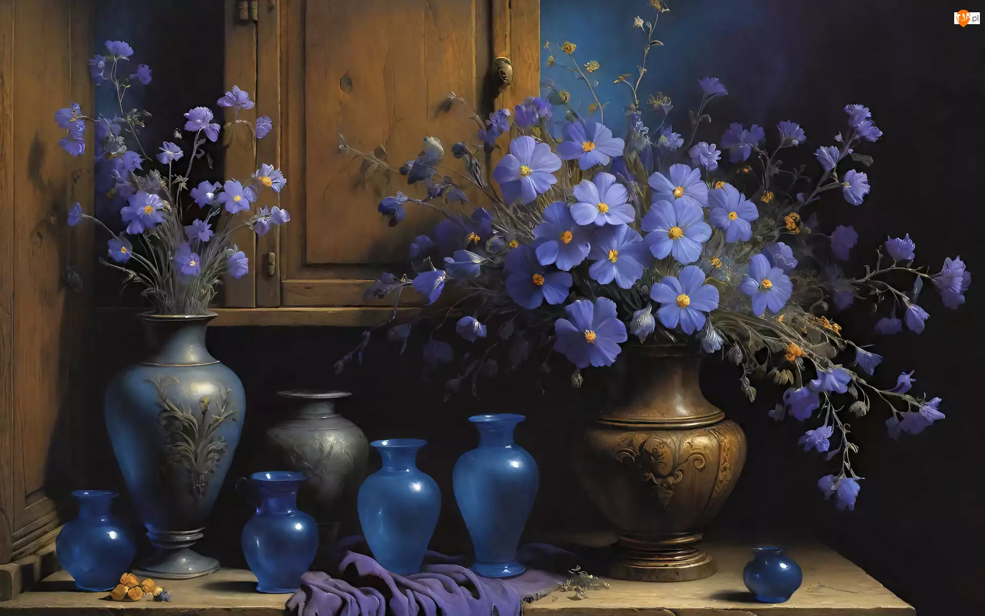 Wazony, Kompozycja, Niebieskie, Kwiaty, Szafka