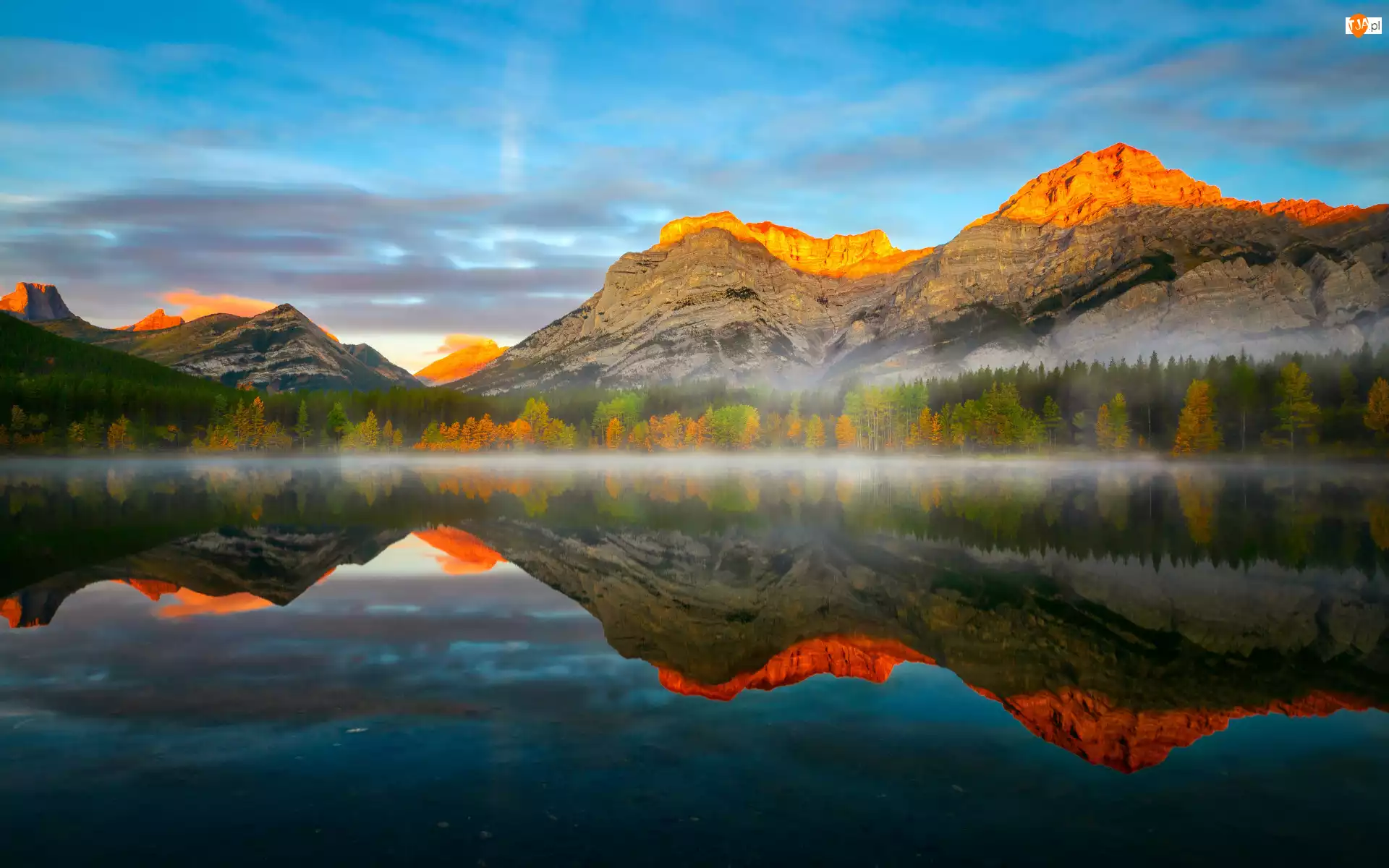 Wedge Pond, Las, Jezioro, Kanada, Odbicie, Drzewa, Canadian Rockies, Mgła, Góry, Góra, Mount Kidd, Alberta
