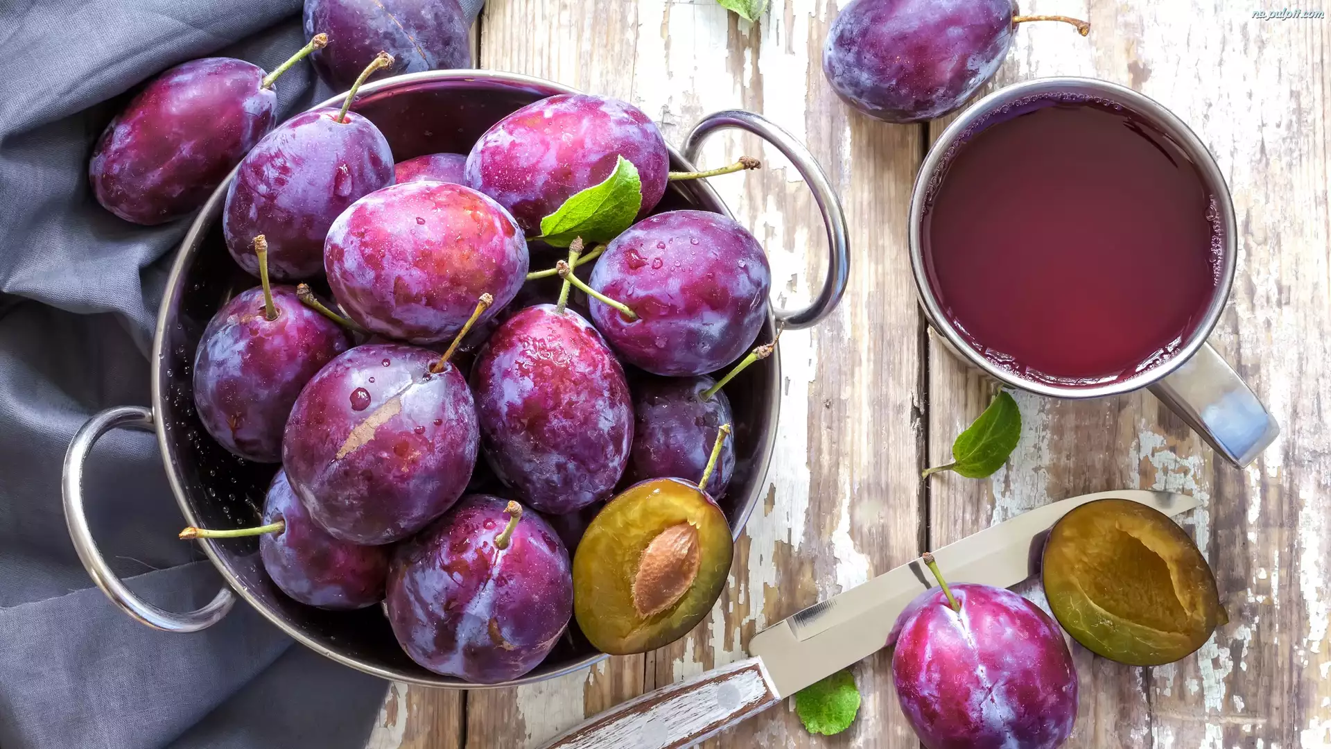 Garnek, Śliwki, Kompot, Deski, Kubek, Nóż