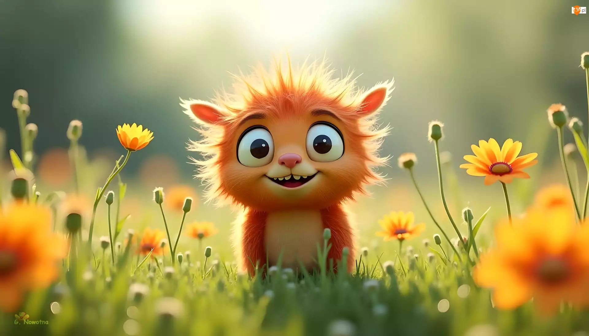 Wesoły pomarańczowy stworek wśród kwiatów w g