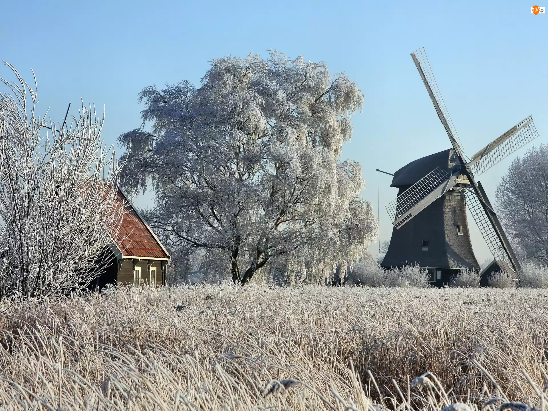 Wiatrak, Drzewa, Oszroniona, Trawa