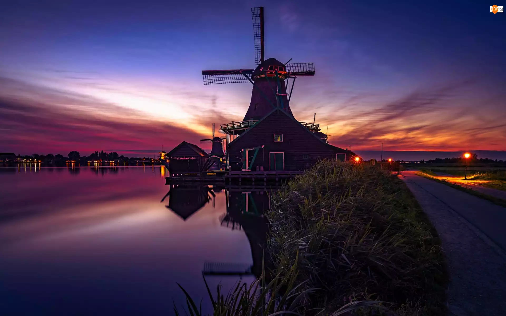 Wieczór, Rzeka, Holandia, Domy, Skansen Zaanse Schans, Wiatrak